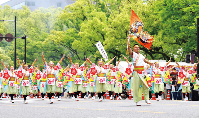 平和大通り一帯を主会場に、演出や衣装に花をあしらったパレードやステージが繰り広げられる。
