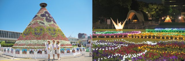 (右)夜になると『平和記念公園』の折り鶴のオブジェが園内を照らす。