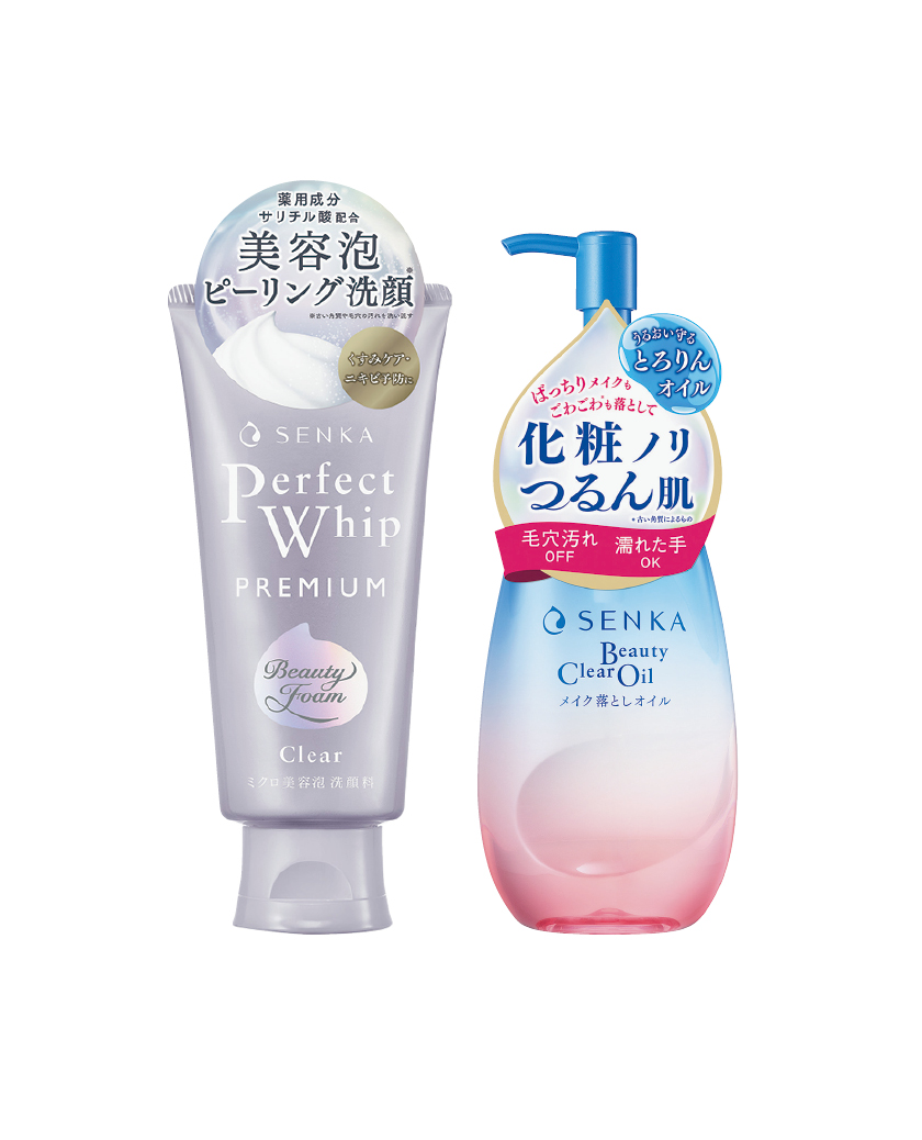 「ビューティークリアオイル」は、とろみ感たっぷりのオイルが、メイクも毛穴も角栓も浮き上がらせて絡め取る。「プレミアムパーフェクトホイップ クリア」は、美容泡ピーリング洗顔により透明感あふれる素肌へと導く。〈SENKA〉プレミアムラインの2品で、憧れの肌をゲット!