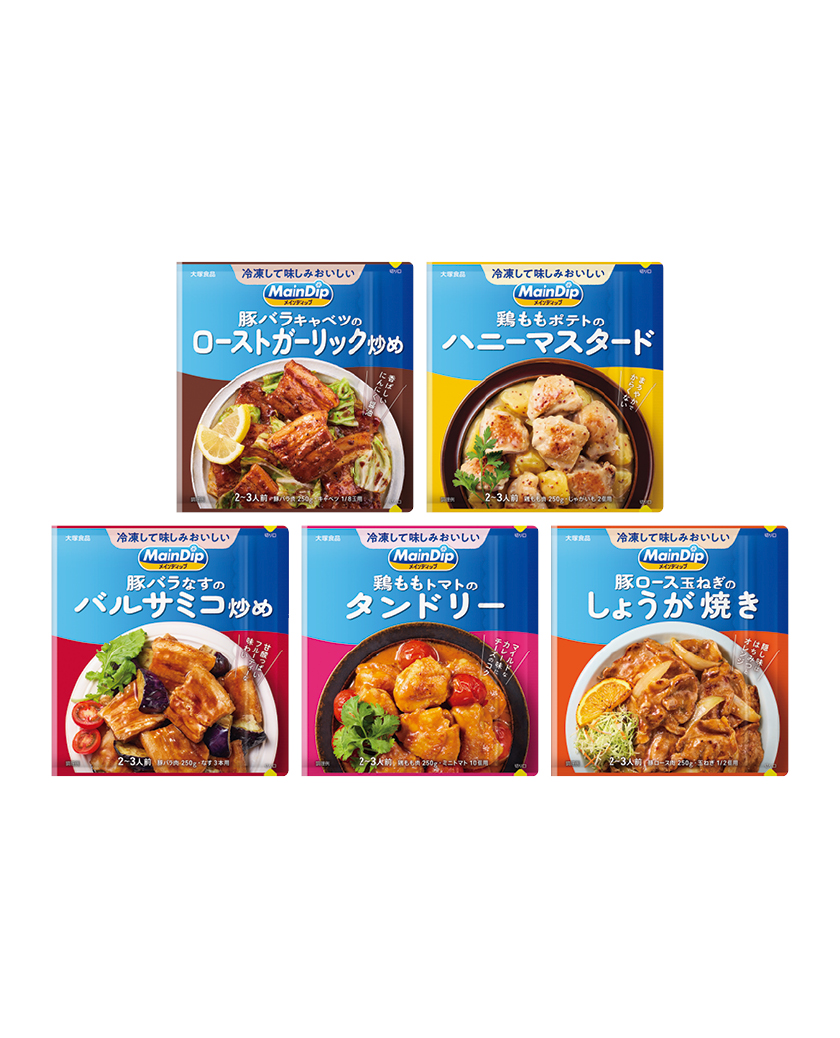 3月に発売された新商品「メインディップ」。調味液入りの袋に用意した肉を入れたら、冷凍庫に入れて〝下味冷凍〟しよう。必要な時に解凍し、野菜を加えてフライパンで加熱すれば、即メインディッシュが完成! バラエティーに富んだ5つの味を各2個の詰め合わせでプレゼント。