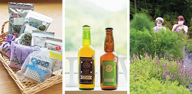 棚には自家製ハーブで作るハーブティー、刺しゅうを施した手作りのサシェ、ラベンダーやローズマリーのクッキー、ハーブソルトなど、ハーブにまつわる商品がずらり。