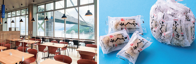 『唐戸市場』などから仕入れる食材を使った料理が関門海峡を眺めながら味わえるフードコートや、天井に巨大なクジラのモニュメントがある売店などが、2021年6月のリニューアルで登場。 展望デッキから見ることができる関門橋は、昼はもちろん、夜の姿も美しい。