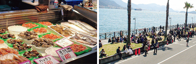地元の漁師や農業者が食材を販売する〝関門の台所〟。 金・土・日・祝には、寿司や海鮮丼などがテイクアウトできる「活きいき馬関街」も登場するので、買い物を楽しんだあとは、海を見渡す外のベンチで味わうのもいい。