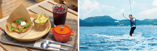 宿泊施設やカフェに加え、サイクリストのサポート、アクティビティーの窓口など、大三島の観光案内所として利用できる複合施設。 目の前に広がる海景色を見ながら、季節ごとのベーグルサンドやドリンクを味わって。