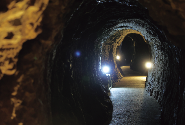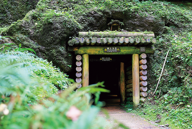 石見銀山には大小合わせて600以上の間歩(銀鉱石を採掘するための坑道)があり、『龍源寺間歩』はその中で唯一、常時公開されている坑道です。代官所の直営だった大坑道の一つで、全長は約600m。ひんやりとした間歩の壁面には、ノミで掘り進められた跡や、排水のため垂直に100mも掘られた竪坑が残っており、当時の坑内の様子を体感できます。