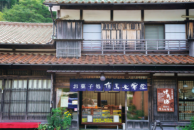 昔懐かしい雰囲気のお菓子屋さんって、つい立ち寄りたくなりますよね。『有馬光栄堂』は、銀山が栄えていた200年以上前から続く老舗の菓子店。かつて坑夫たちも食べていたと言われるサクサク食感の「げたのは」や、大豆が入った「銀山あめ」などの手作りおやつは、どれも素朴でやさしい味わい。ドライブのおともや、おみやげに買って帰ろう。