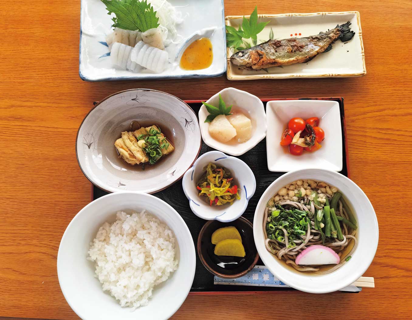 雄橋に続く遊歩道入り口にある食堂で、自家栽培の米や地元産野菜を使った定食が人気。