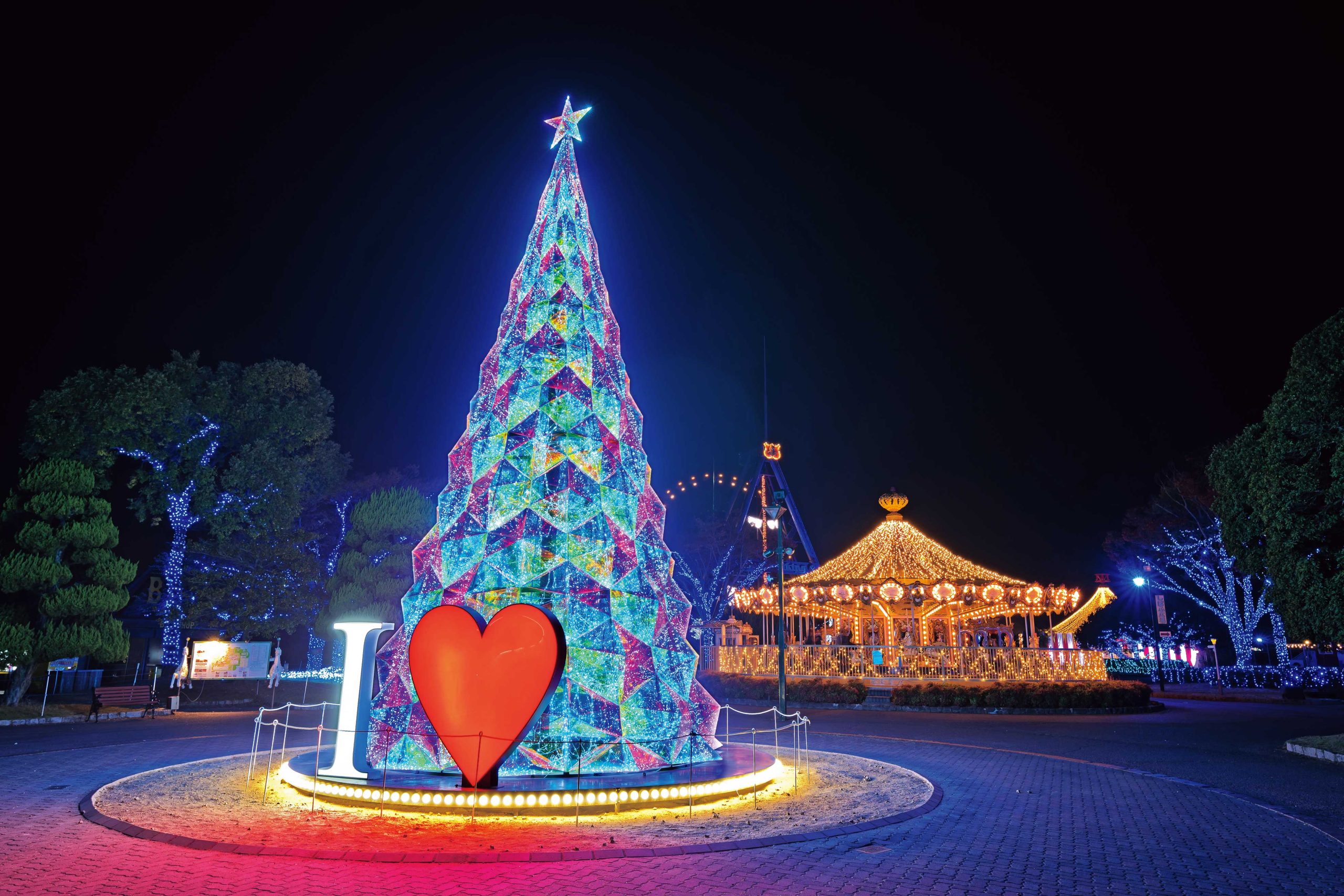 約250万球のLED電球が園内を照らし、観覧車などが色鮮やかに光り輝く。