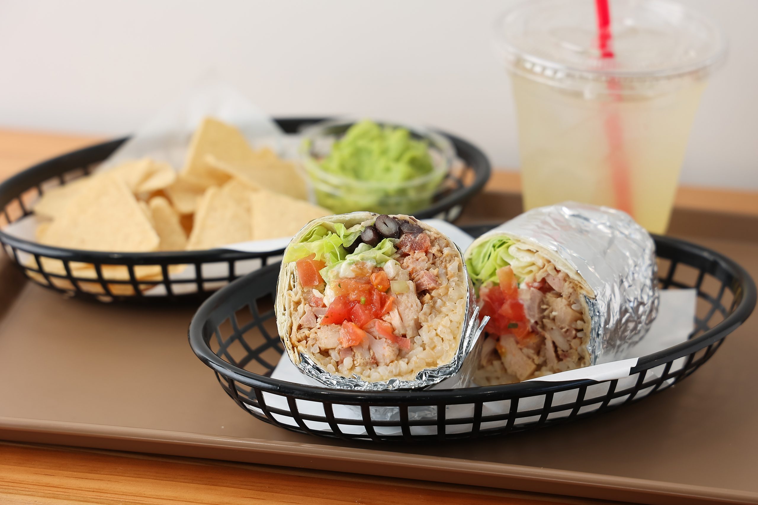 メキシカンチキン980円(写真はレギュラー、グランデは1,280円)。トルティーヤチップス&ワカモレ、ドリンクが付いたセットは+650円。イートイン利用だと、食べやすいよう半分に切って提供される。ブリトーは、基本の具材は同じで主にメインが選べるスタイル。メインの具はメキシカンチキンのほか、3時間低温調理した豚肩ロースをオレンジや玉ネギ、スパイスと柔らかくなるまで煮込んだメキシコ風プルドポーク・カルニタス1,030円~、トマトペーストやスパイスと炒めたタコミート1,030円~、アボカドのクリーミーさが絶妙なベジタリアンワカモレ1,080円~の全4種類を用意。