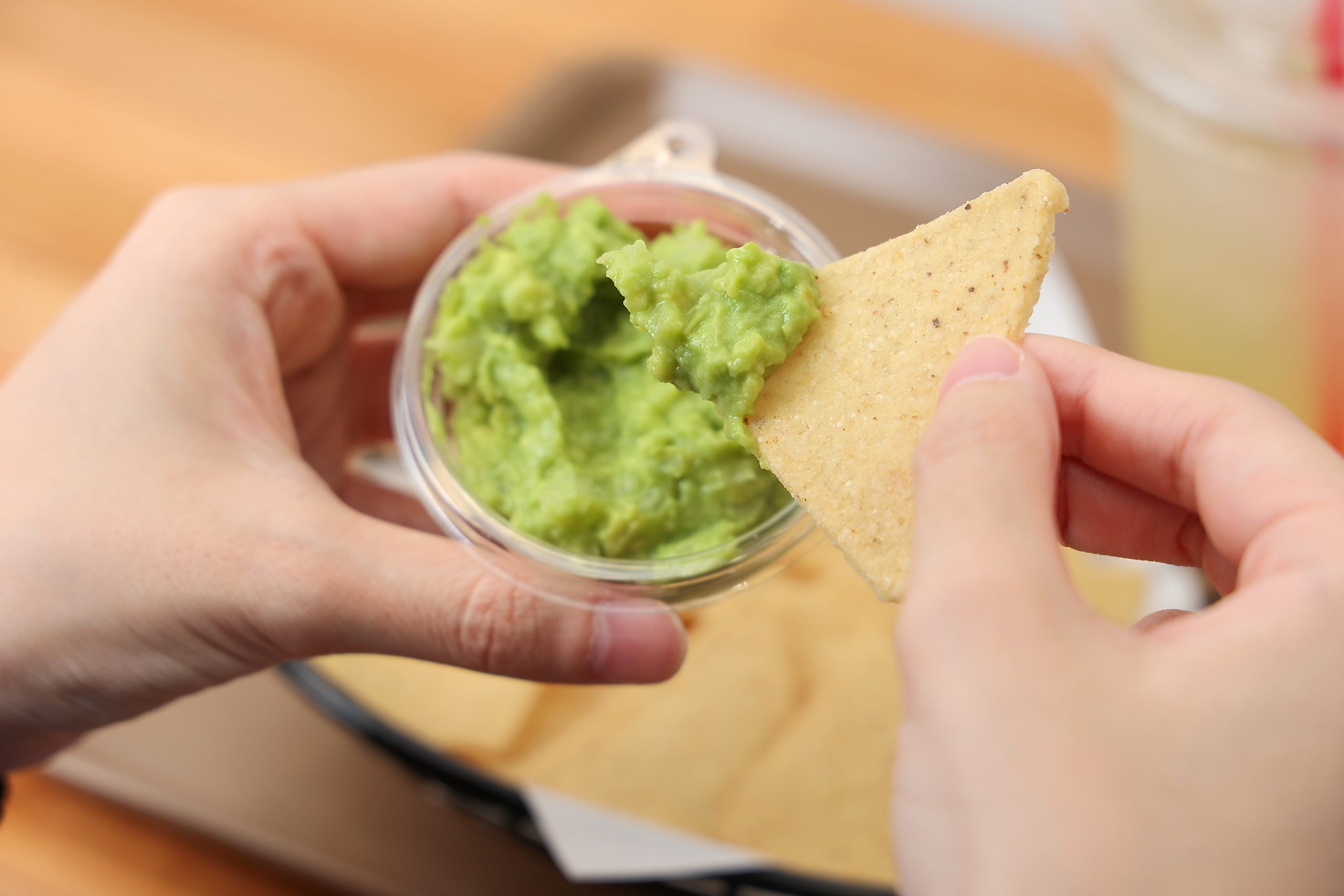 毎朝手作りするワカモレは、フレッシュな完熟のアボカドを使いクリーミーに仕上げている。塩味の効いたトルティーヤチップスをディップして楽しもう。トルティーヤチップス&ワカモレ単品は480円、チップスとトマトサルサのセット380円もあり。