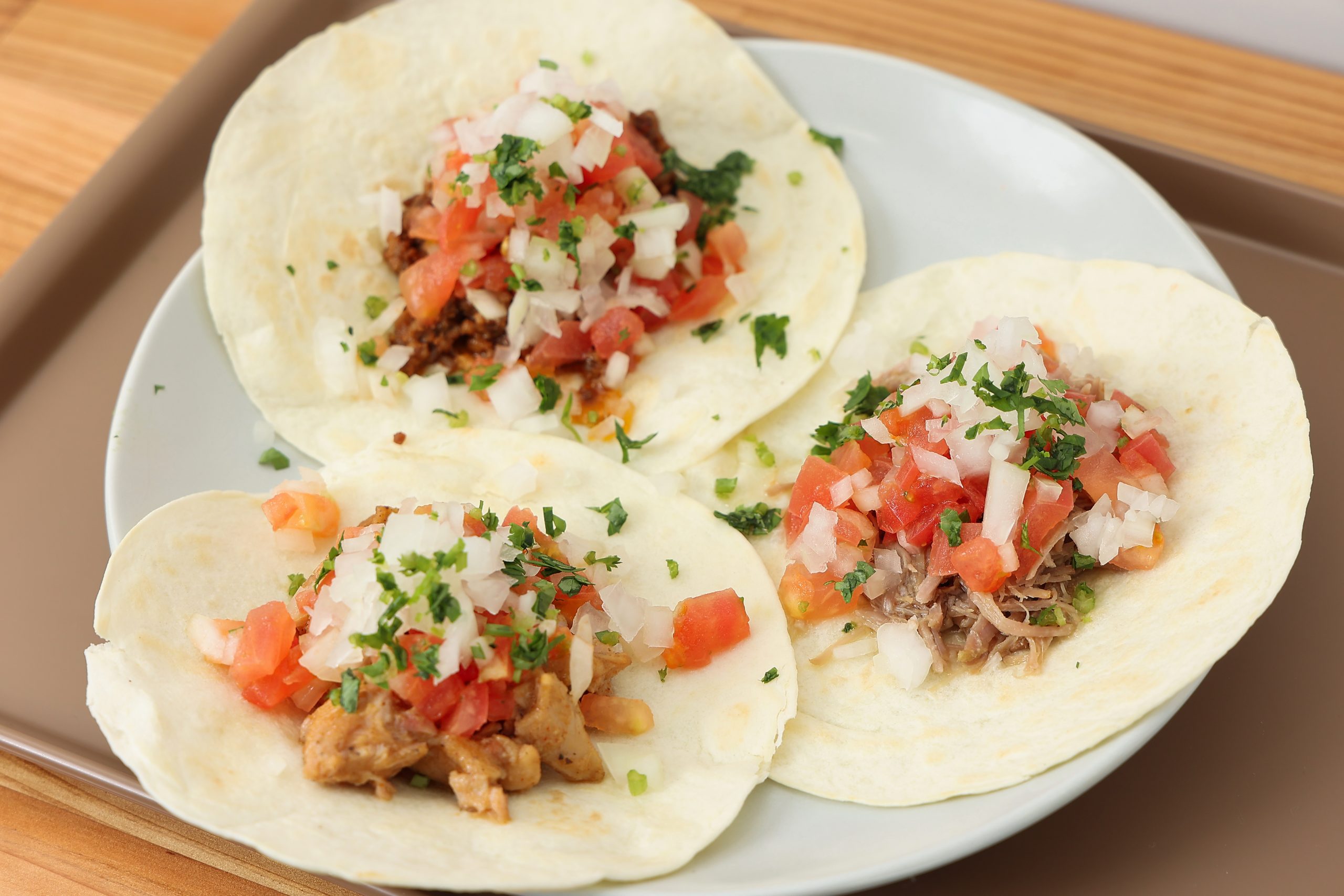 トルティーヤにメインの肉類、トマト、玉ネギ、好みでパクチーを添えたタコスもオススメ。メキシカンチキン、ポークカルニタス、タコミート各430円、選べる3ピースセット1,200円。そのほか、新メニューとしてメキシコ発祥の料理・ナチョスが仲間入り。トルティーヤチップスに、タコミートとチーズをたっぷりのせてオーブンで焼き上げている。