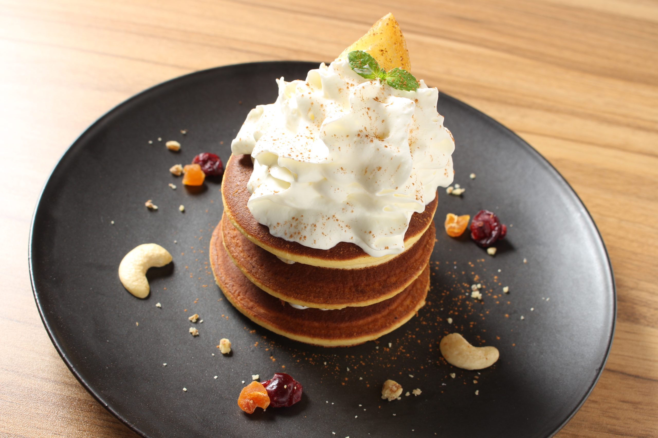 そんな中で楽しめるのは、オーナーの深井さんが「日本酒バーとの繋がりを持たせたくて、〝米〟を使ったスイーツを」と考案した、広島県産米粉を用いたパンケーキ風のどら焼き。米粉が入ることで、もちっとした食感かつ、軽やかな生地に仕上がっている。その生地をパンケーキのように重ね、あんこや果実などを挟み、上にふわふわのエスプーマソースをのせたビジュアル映え抜群のメニューだ。一番人気の「りんごバターとヨーグルトエスプーマ」1,200円は、さわやかな酸味のあるエスプーマとリンゴバターの相性抜群で、ぺろりと平らげてしまうはず。