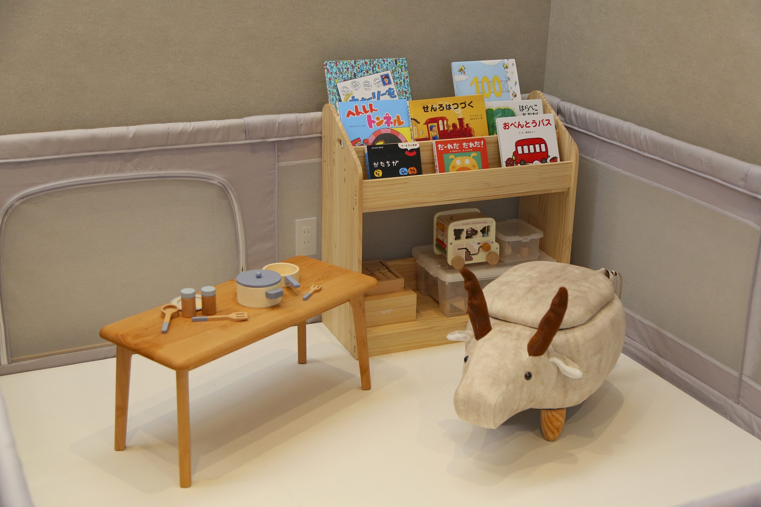 店内の一角にはキッズスペースもあり。幼児向けの絵本やおもちゃ、新生児期から生後3・4カ月用のクーファンも用意されているので、子ども連れでも利用しやすいのがうれしい。