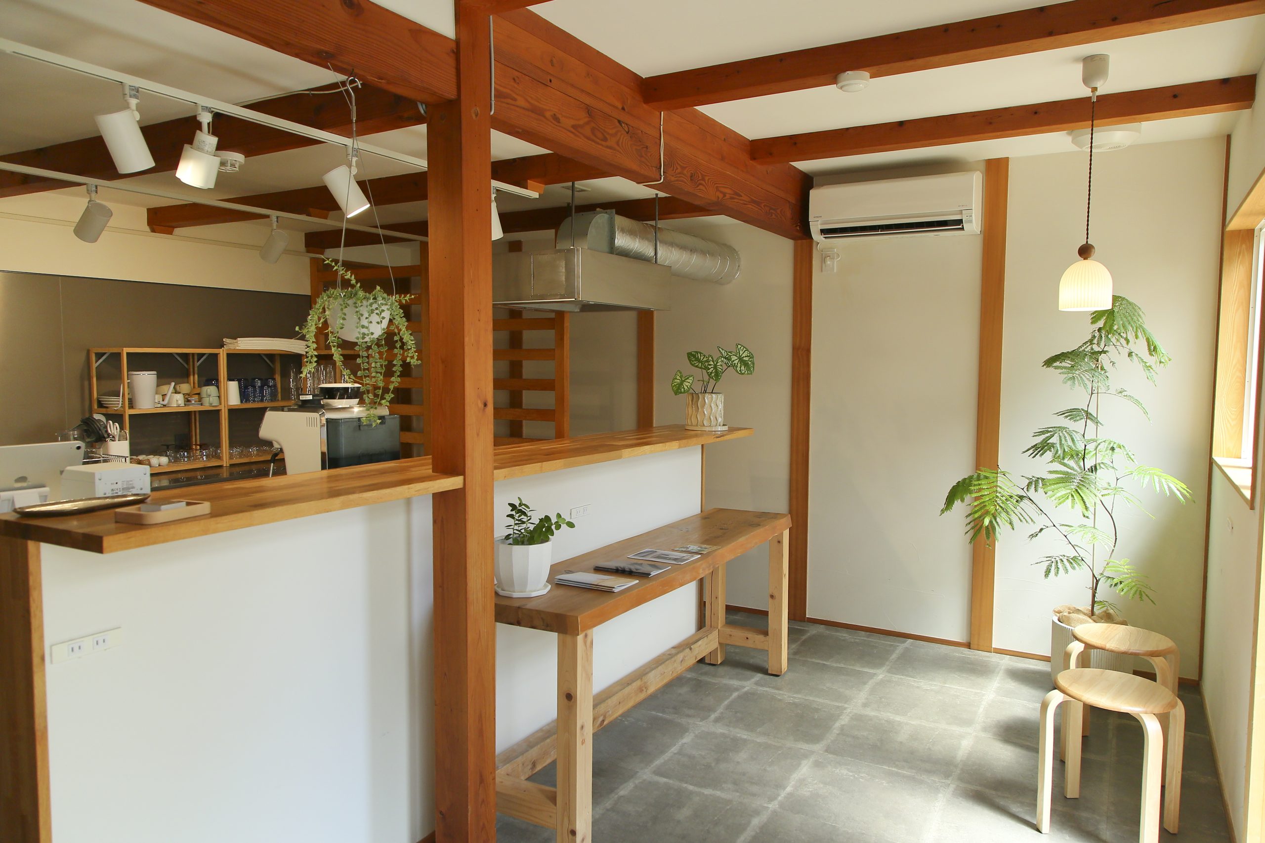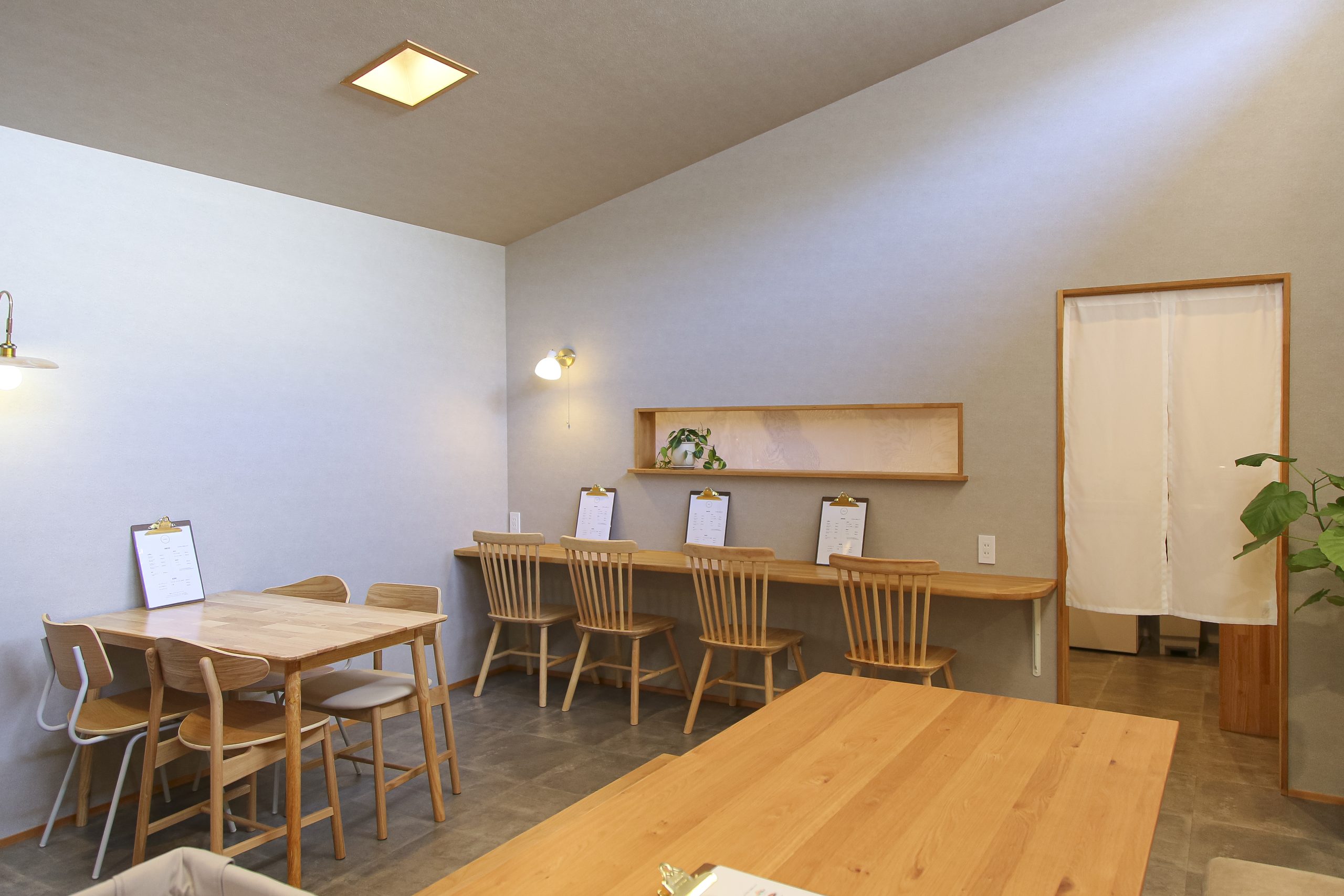 カフェは、福山市の住宅街にある工務店の事務所『Tamada工房 anmebase(アンメベース)』に併設。木目調のインテリアとやわらかな照明に包まれた、開放的な店内だ。「日常の合間に、小さなご褒美とやすらぎを」というコンセプト通り、リラックスできる空間になっている。