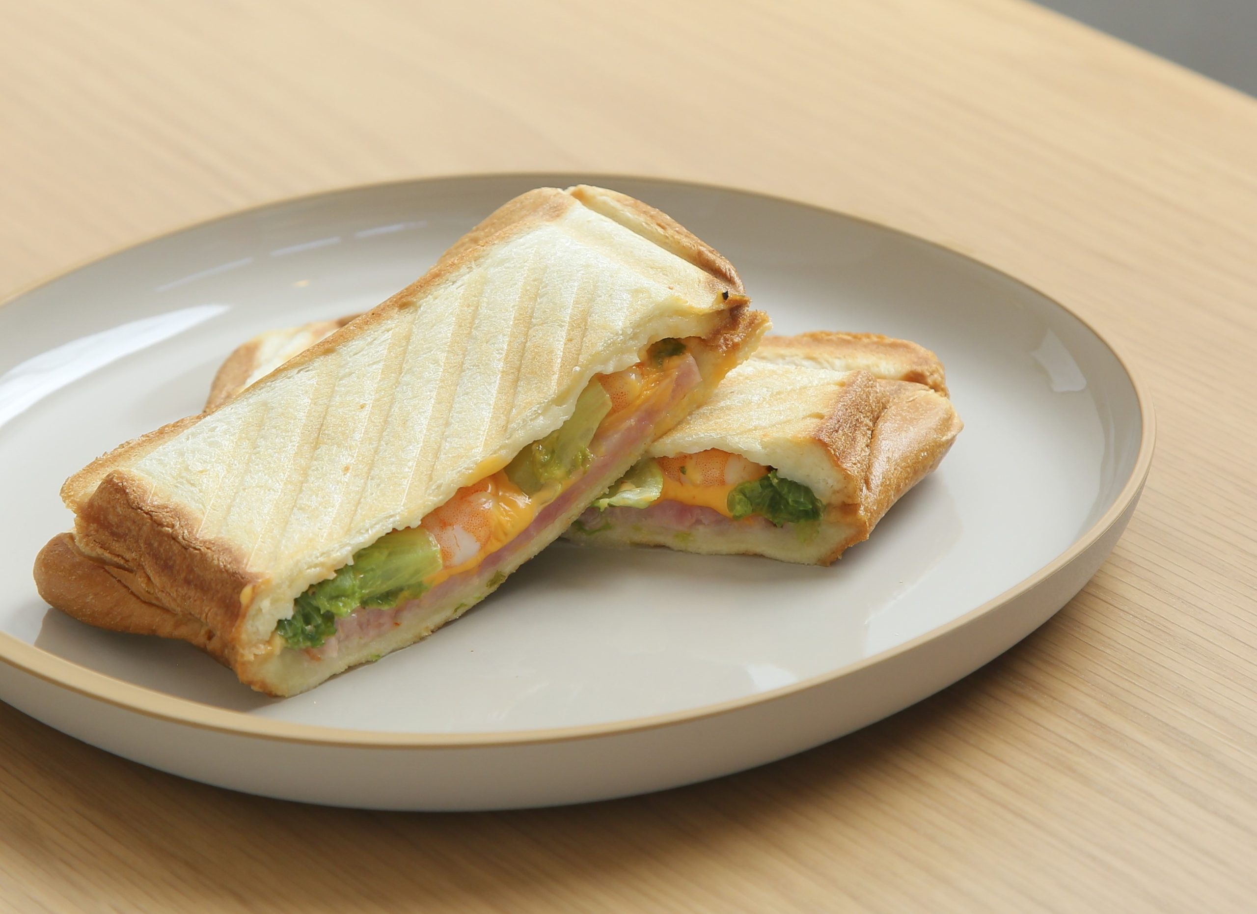 9月に登場したのは、新メニューのホットサンド。表面をカリッと焼いたパンに、エビ&レタス750円(写真)、卵&ハム650円といった具材を挟んでいる。今後、種類が増えていく予定なのでお楽しみに!