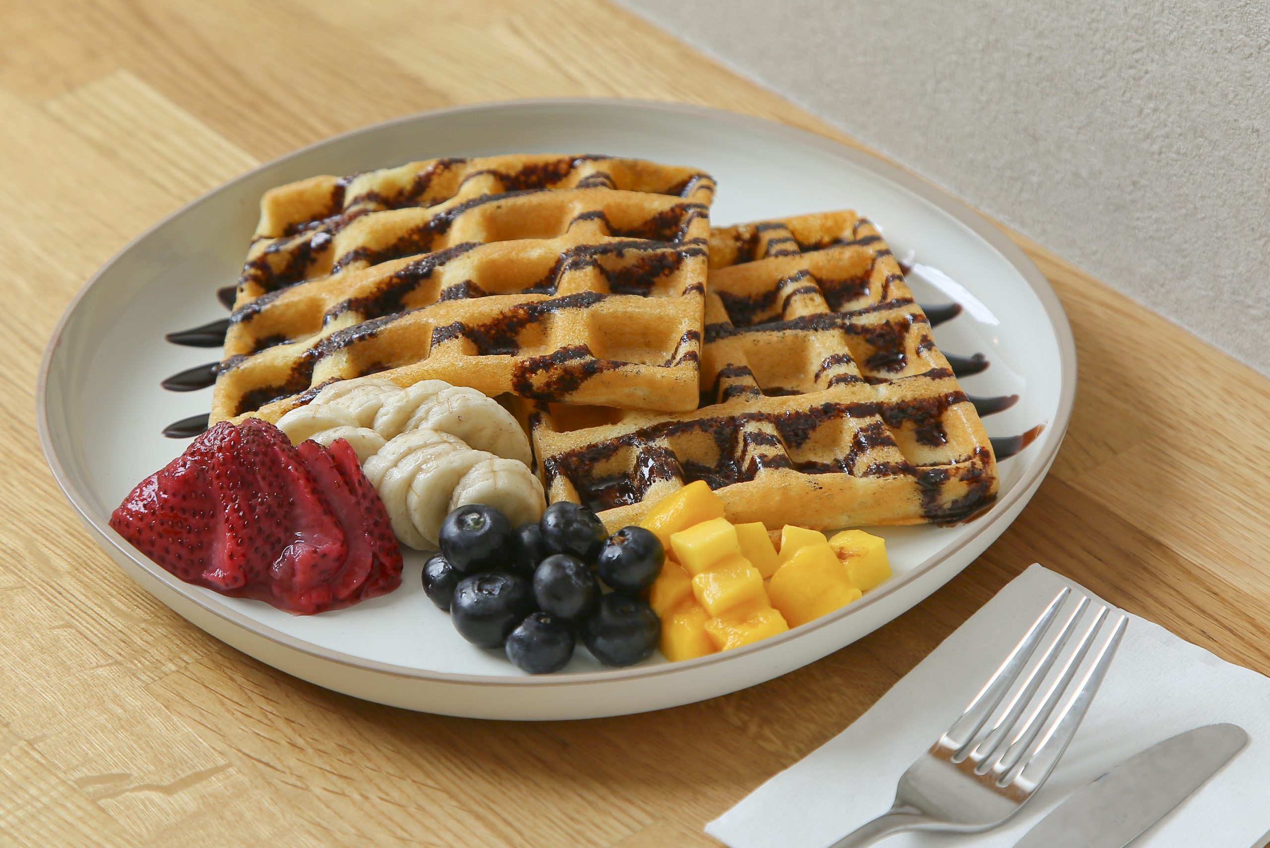 ワッフルは、米粉・豆乳・きび砂糖など、自然由来の素材を中心に使用しているのがポイント。優しい甘みのワッフル1枚400円(追加は1枚200円)に、果物やハチミツ(各100円)、チョコレートやメープルシロップなどのソース(各30円)をトッピングすることが可能だ。生ハムや期間限定で焼き芋などもあるので自分好みにカスタムしてみて。写真はワッフル2枚に果物4種類とチョコレートソースを追加して1,030円。