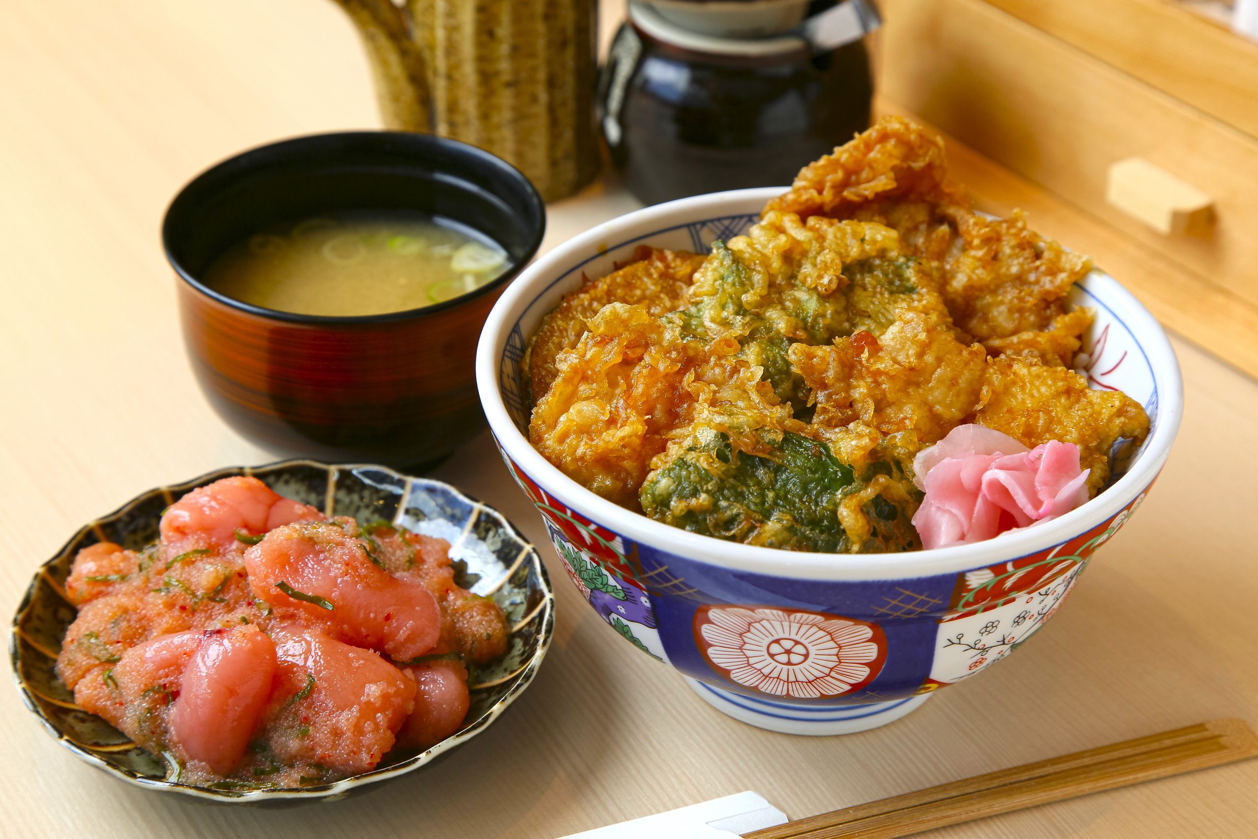 こちらは鶏モモ、大葉ササミ、豚みそ漬けの天ぷらが乗った食べ応えのある肉天丼1,309円。甘めのタレにくぐらせた一杯を召し上がれ。全てのセットメニューに付くめかぶ明太子は、食べ放題なのがうれしい! そのままはもちろん、天ぷらやご飯と共に味わおう。