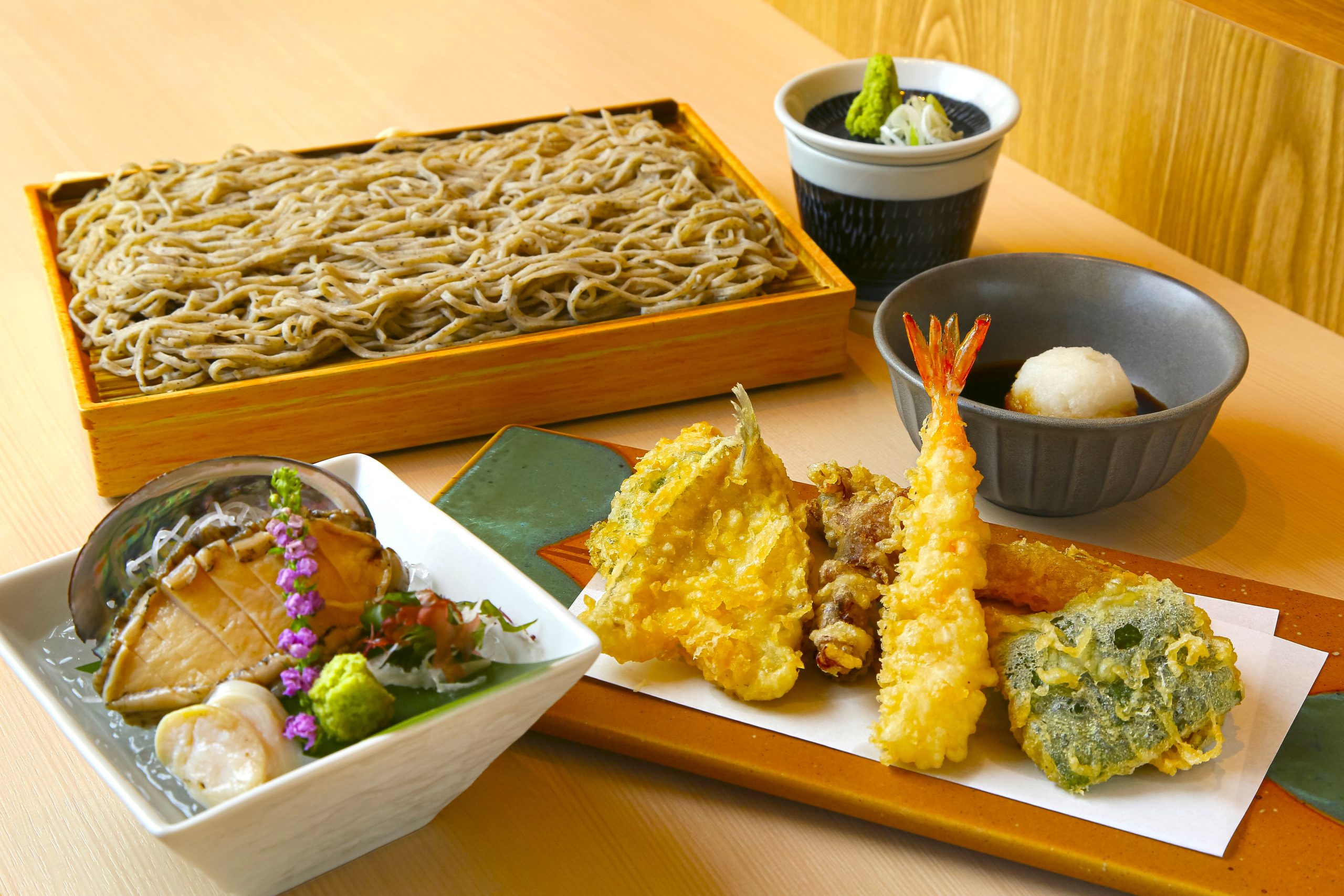 オススメは、6種類の天ぷらが味わえる「一代御膳 せいろ蕎麦」2,519円。天ぷら盛り合わせとそばのほか、刺身・煮付け・天ぷらの3種類から選べるアワビ料理などが付いたボリューミーなセットだ。天ぷらは、揚げたてを楽しんでもらうために、2回に分けて提供される。キスやサケといった旬の食材だけでなく、地元の特産品を使ったバラエティーに富んだラインアップ。そのほか、ごはんとみそ汁が付いた天ぷら定食、ミニ丼とそばのセットもスタンバイしている。