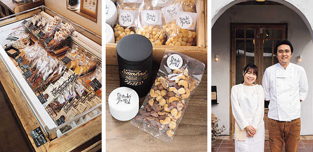 入口近くには燻製ナッツ、スモークマカダミアチーズ、ピスタチオなどが、奥の冷蔵ケースにはブランド豚〈瀬戸もみじ〉や〈ひろしまハーブ鶏〉、チーズの燻製商品がスタンバイ。