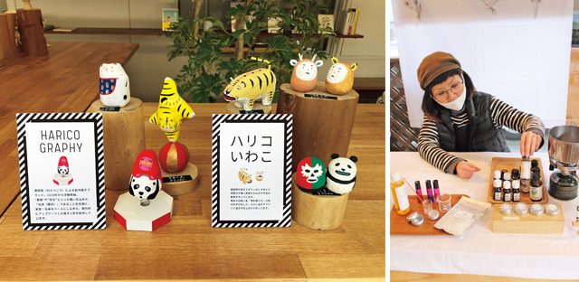 さらに、全国各地の若手作家が手がけた郷土玩具の販売コーナーや、植物療法士の資格を持つ綾子さんによるアロマ体験ブースも。
