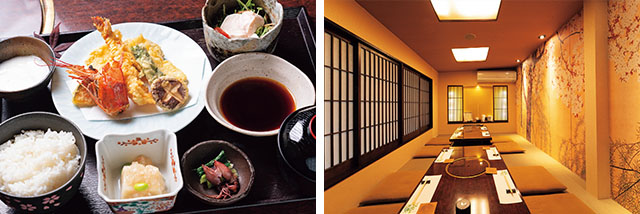 限定10食の週替わり御膳880円。この日のメイン料理は特大エビ天と野菜の天婦羅。他にも焼肉丼、トンカツ、ハンバーグなどが登場する。カウンター席のほか、落ち着いた雰囲気の個室や半個室を用意。