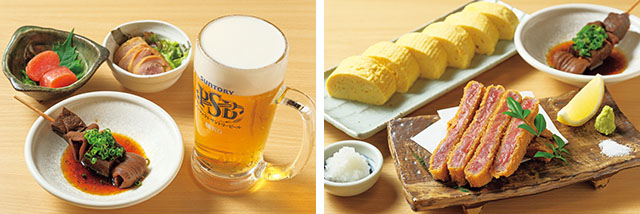 ほか、サシが入った神石牛をレアに揚げ、上質な肉のうま味を薄い衣で閉じ込めた牛カツ、口の中でジュワッとカツオだしがあふれ出すだし巻き卵、ほろほろになるまで炊いた甘辛い関東煮といった、お酒のススム単品メニューも終日注文可能。