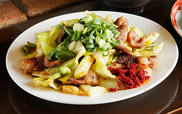 威勢のいい男性スタッフが迎えてくれる、福山駅裏の鉄板焼き店。おすすめは、脂のりのいいホルモンのぷりっとした食感とキャベツのシャキシャキ感が引き立つ、赤センタレ焼き800円だ。しょうゆベースの自家製タレが絡めてあり、ご飯やお酒と好相性。お好みで、豆板醤や七味などを合わせたオリジナルの辛みそを付けながら味わって。店内には、テーブル席のほか鉄板前のカウンター席がある。