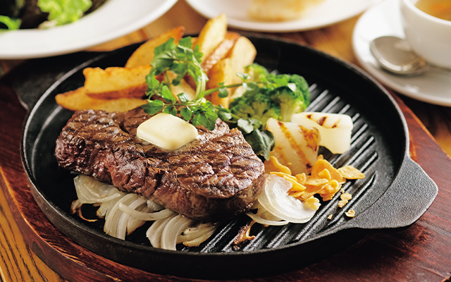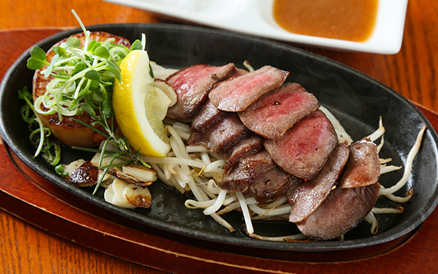 赤身が柔らかな純正ブラックアンガス牛を扱う肉バル。ランチに登場するテンダーロイン(ヒレ肉)ステーキは、脂身が少なく上品な味わいが特長で、うま味の強いオニオンガーリックソースと好相性だ。鉄板でサーブされるので、食べ進めていく間にレアからミディアムレアへと焼き加減が変わり、食感の違いも楽しめる。ステーキ150gにサラダ、スープ、ライスorパンが付いて2,750円。