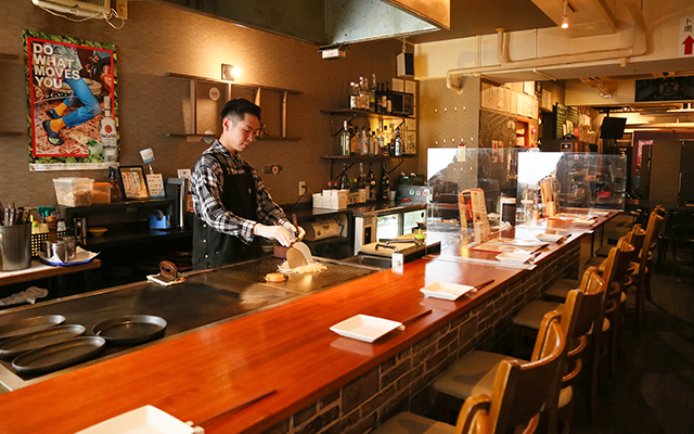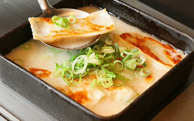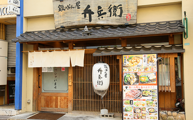 和モダンな佇まいが落ち着いた雰囲気の鉄板焼き専門店。ライブ感あふれるカウンター席のほか、個室も充実している。ボリューム満点のお好み焼きや肉料理、うにホーレンなど気になるメニューが目白押しだが、まずは名物の弁兵衛ギョーザ(650円)をチェック。鉄板でカリッと焼き目をつけた特製の棒ギョーザを、豚骨スープの中にドボン。タレではなく、スープと共に味わう斬新なスタイルが評判だ。