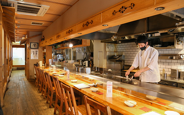ジュワ~っと湯気が上がる鉄板のライブ感を、間近に体感しながら多彩な料理を楽しめる一軒。肉食系を唸らせるメニューは数あれど、イチオシはタンステーキ(100g1,848円)。ブロックのまま鉄板で焼き目を付けたら、オーブンでじっくりとロースト。サクッとした軽い歯ごたえが小気味よく、牛タン特有の甘みが口の中いっぱいに広がる。バター醤油で香ばしく焼いた付け合わせの大根ステーキも絶品。