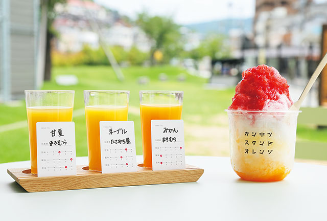農家直送の瀬戸内産柑橘ジュースをはじめ、かき氷、サワー、ビールといったメニューを味わうことができる。