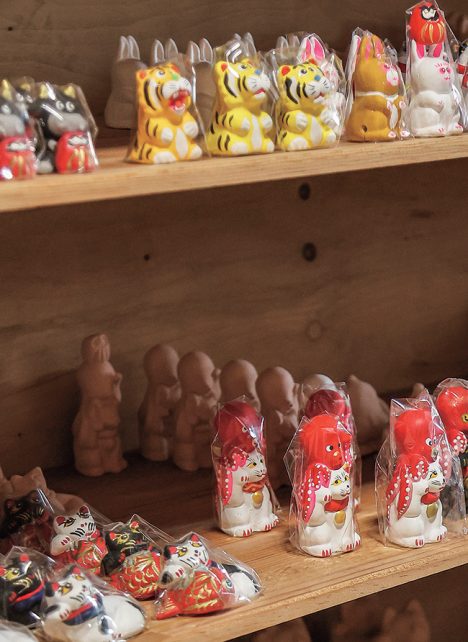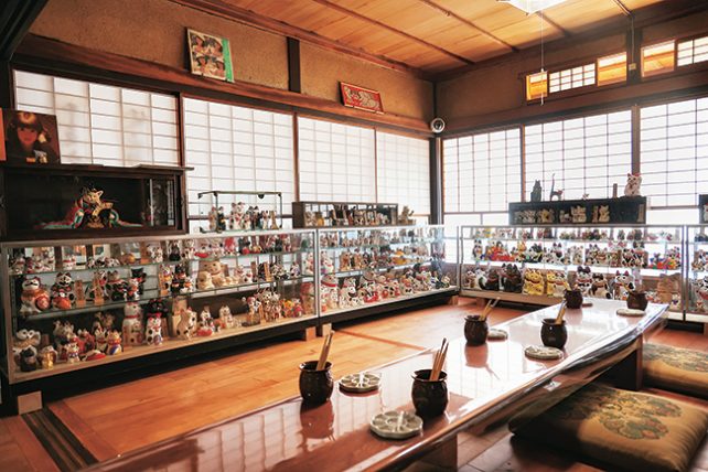 その隣には民芸品の工房兼ショップ&招き猫ギャラリーがあり、父の雅也さんによるオリジナル民芸品「あくら土人形」の工房見学と作品の購入が可能。