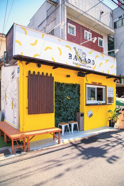 黄色い外観が目を引くこちらは、完熟濃厚バナナジュースとグルテンフリーの米粉チュロスのテイクアウト店。