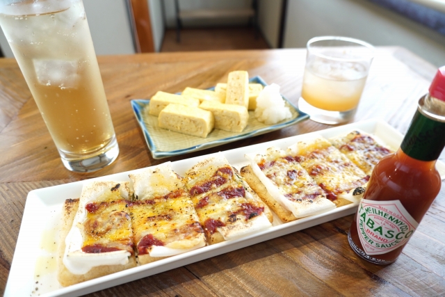 8月3日からは夜営業がスタートし、お酒と好相性な一品料理が味わえるように。オススメは、油揚げに大葉と2種類のチーズ、餅をトッピングしたもっちり食感のピザ450円~(写真はフル850円)。花かつおと日高昆布でとっただしで作られる、焼きたて出汁巻き卵500円も人気を集めている。ハイボール、あらごしゆず酒各600円といったお酒を飲みつつ堪能した後は、おむすびや豚汁でシメよう。