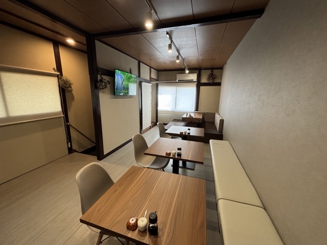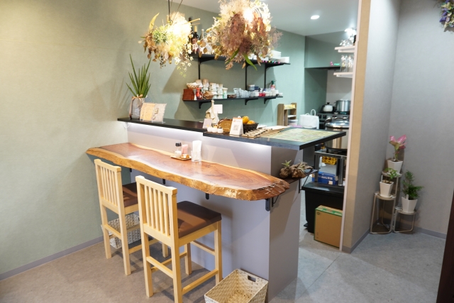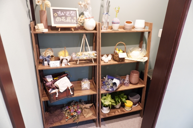 淡色の空間がオシャレな1階スペースに、厨房とカウンター2席がスタンバイ。2階には、テーブル席と畳の小上がり席が設けられている。好きな席で思い思いに食事を楽しもう。合わせてチェックしてほしいのが、1階の一角にある「ちいさなお花屋さん」スペース。フラワーショップに勤めていた二反田さんが作ったブーケなどが販売されている。ぜひのぞいてみて。