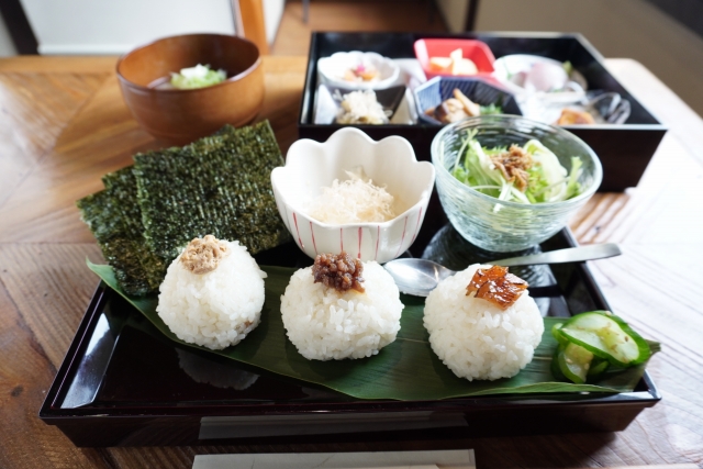 イチオシは、ランチ限定メニューの松花堂セット1,800円~(価格はおむすびの種類に応じて変動)。好きなおむすび3種類のほか、自家製豆腐、サラダ、小鉢6種類、具だくさん豚汁もあり…とボリューム満点! このほか、お手頃価格の豚汁セット900円~も用意される。