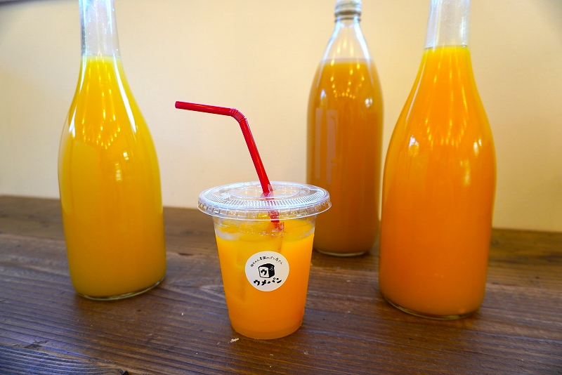 江田島市能美町『Coffee Roast Sereno』の焙煎豆を使ったコーヒーや、自社農園の柑橘を原材料にしたドリンクも販売される。フレッシュな酸味と甘みが楽しめる「しらぬい100%ジュース」500円など、テイクアウトしてパンと一緒に味わうのもいい。