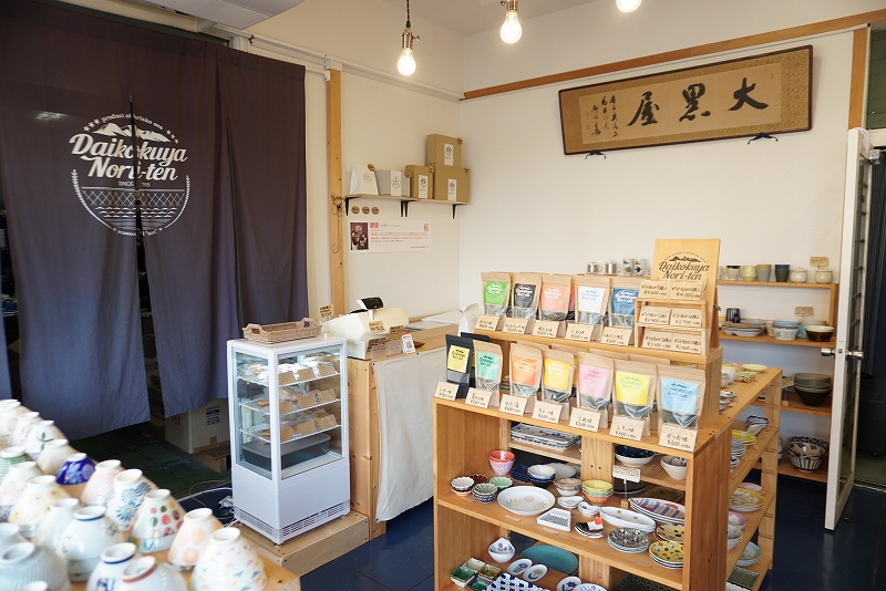 自社製品の海苔や、𠮷川さんが現地で買い付けてきた波佐見焼・美濃焼を中心とした器も販売。おしゃれなパッケージデザインの海苔648円~は、バター味・明太子味・レモン味・うめ味といったユニークなフレーバーがそろう。器も茶碗・平皿・小皿・湯飲みなど多彩な品が並ぶので、お買い物もぜひ楽しんで。