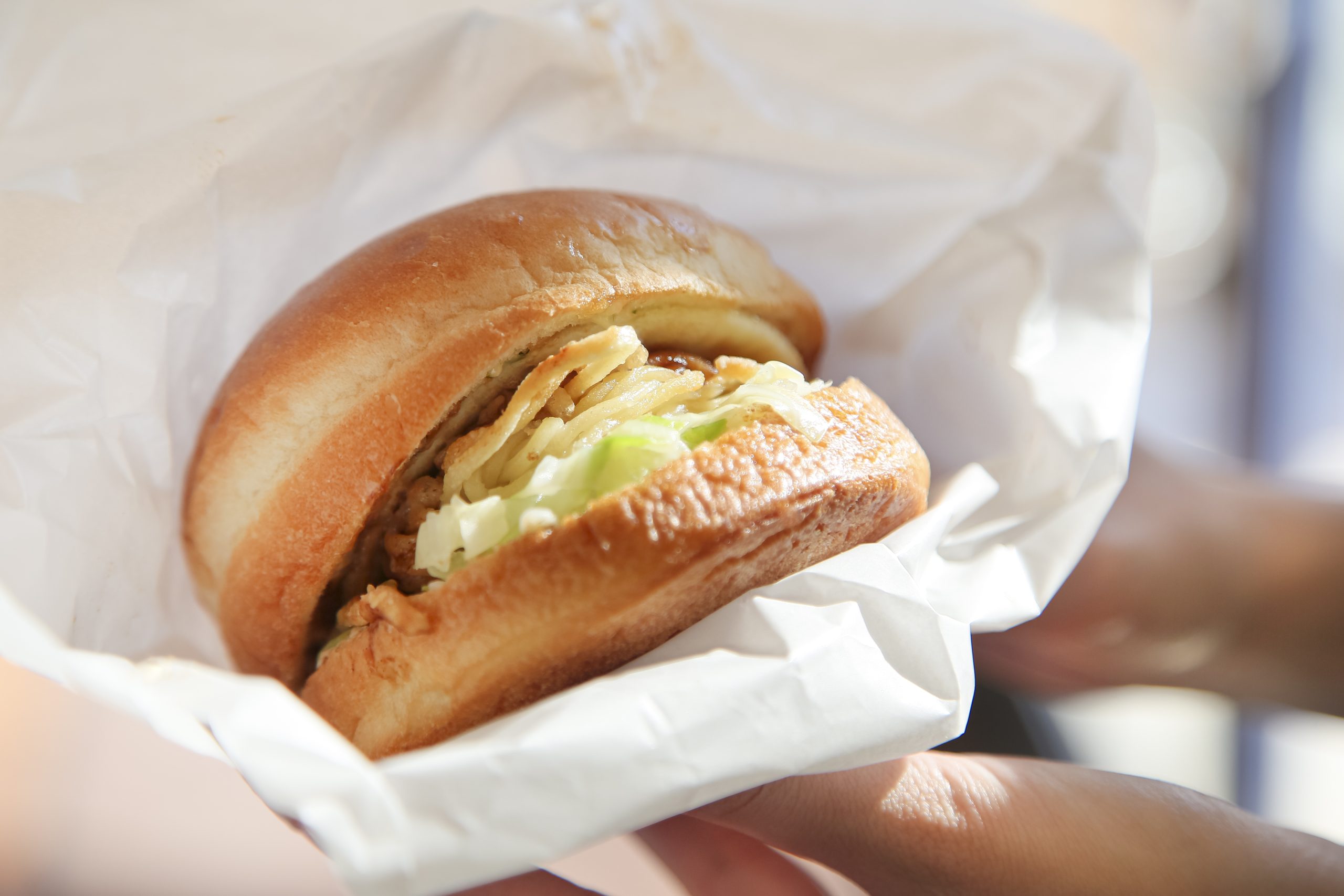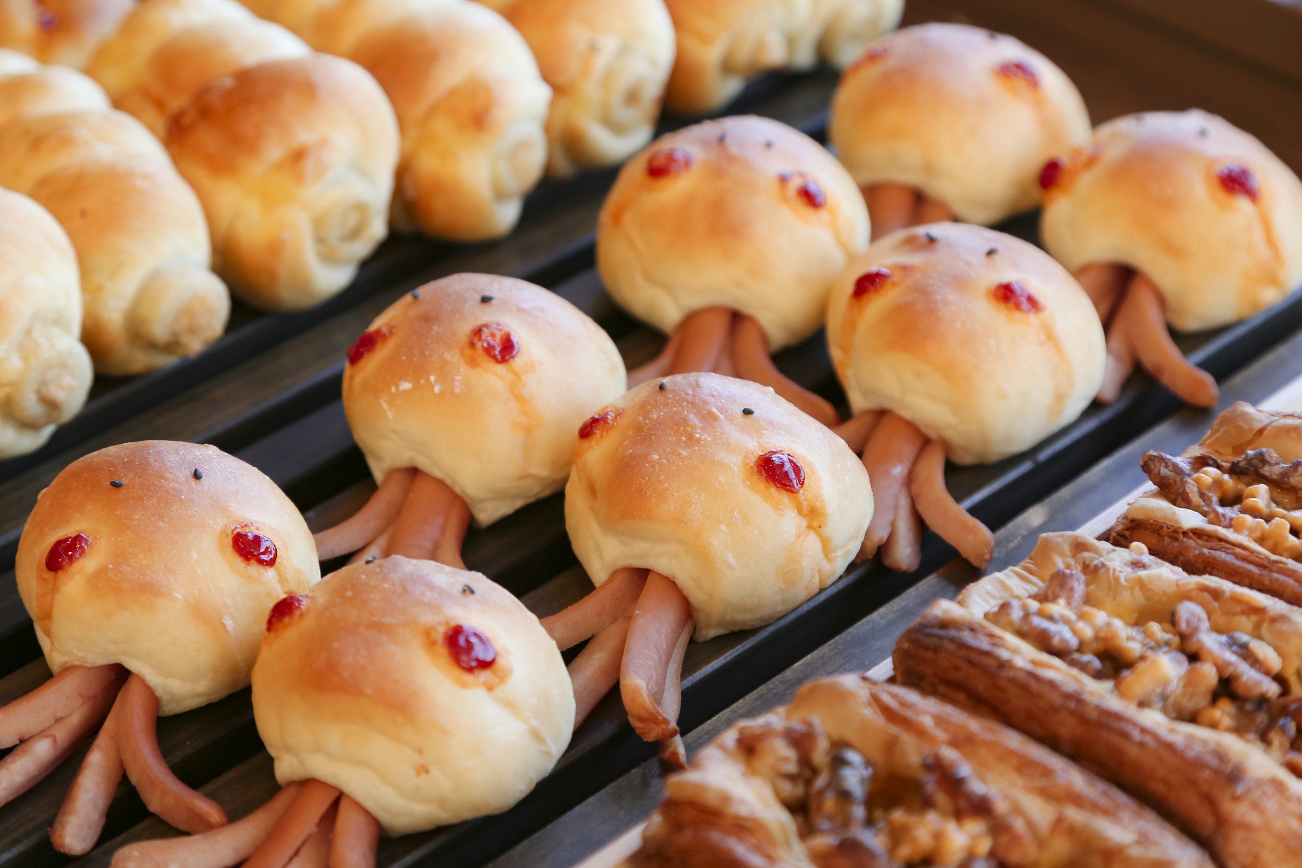 ウインナーをタコの足の形に切って、バターロール生地で巻いた「宇宙人」100円。黒ゴマとケチャップで描かれたかわいらしい顔が評判で、老若男女に人気。サイズ感は小ぶりのため、手軽に食べられるのが◎。