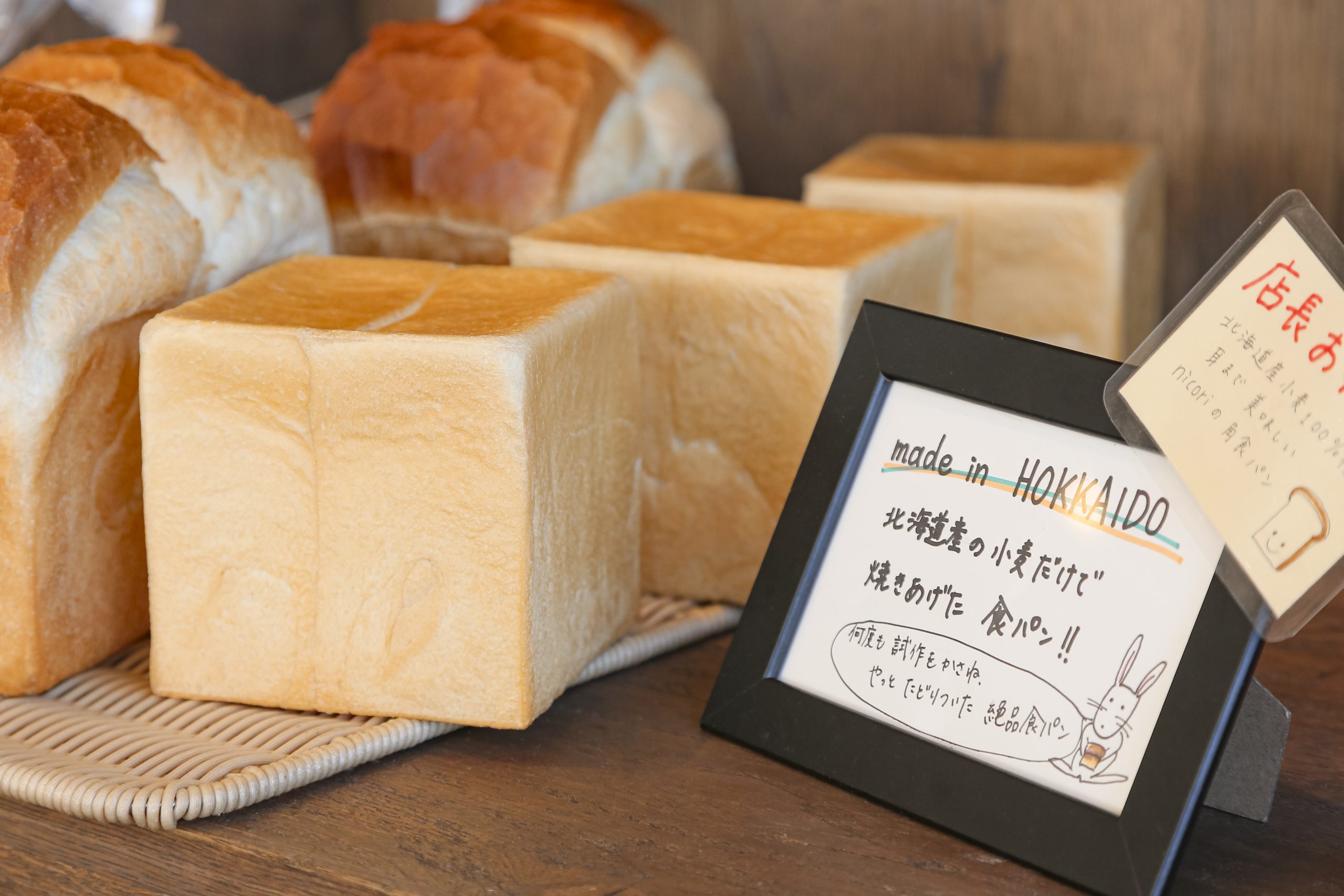 北海道産の小麦を100%使用した角食パン1斤290円。パン生地にお湯を加えた「湯種製法」により、耳まで柔らかく仕上げている。グルテンを含まない米粉食パン460円やハード系のイギリス食パン1斤280円といった特徴の違う3種類から好みの物を選ぼう。