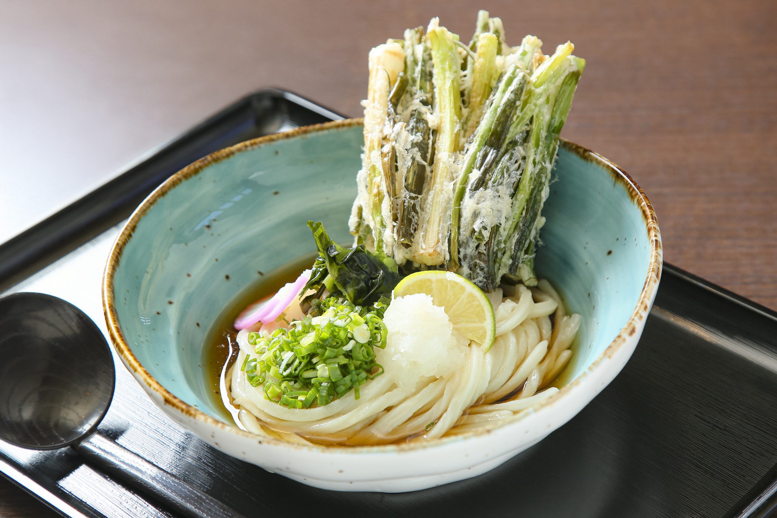 さらにインパクト大な見た目の名物があり、1つ目はわけぎの天ぷらがのった「岩子島うどん」750円。岩子島の農園『政兵衛ファーム』から仕入れるわけぎを切ってそのまま天ぷらに。衣が薄いため、ネギよりも辛味が少なく甘みのあるわけぎ本来の味わいが楽しめる。わけぎの旬である10~4月のみ提供予定。