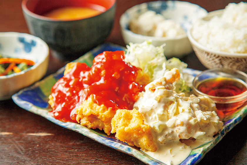 サクッと軽い食感の衣をまとったムネ肉に、自家製タルタルソースをたっぷりかけたチキン南蛮は、別添えの甘酢で味変もOK。
