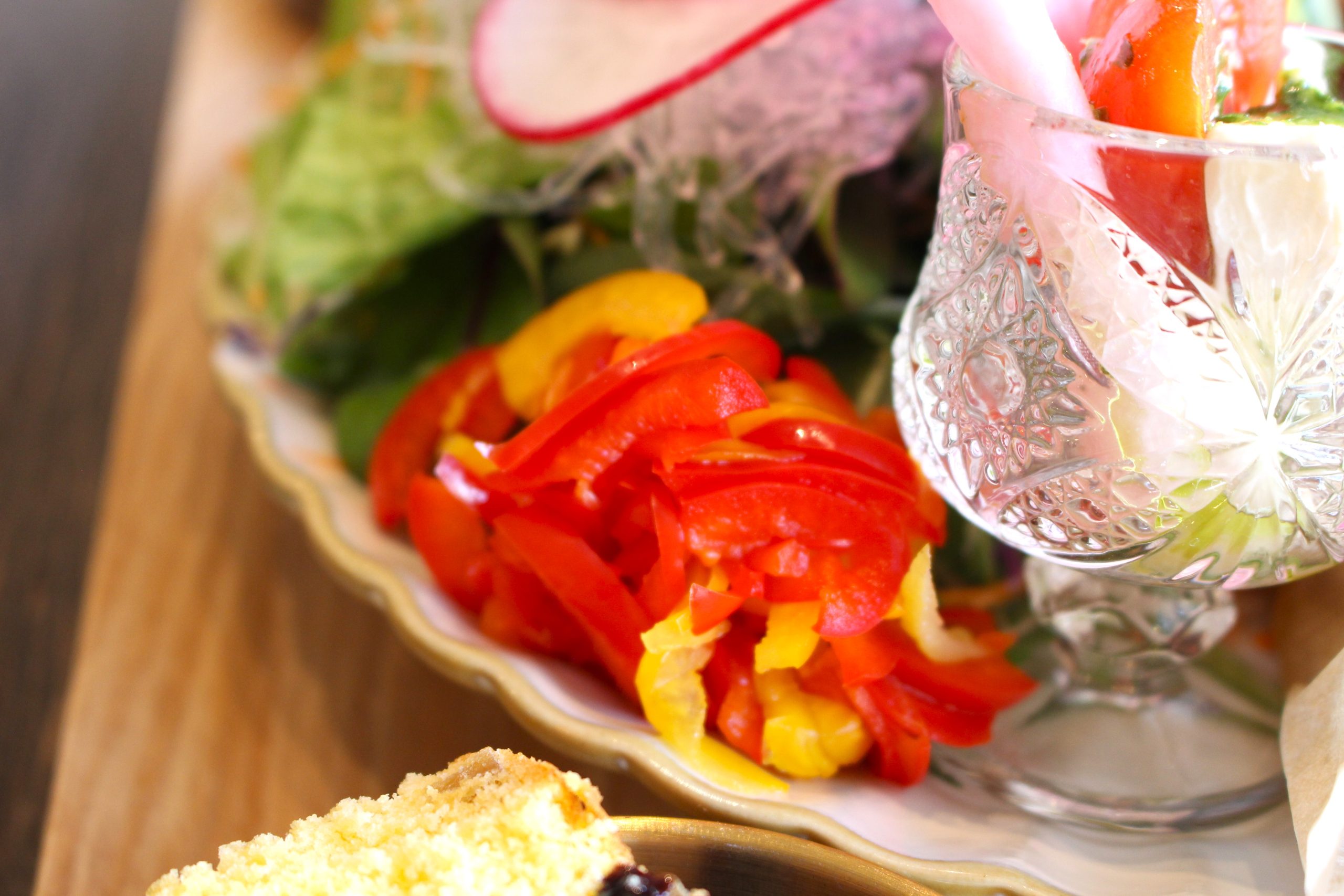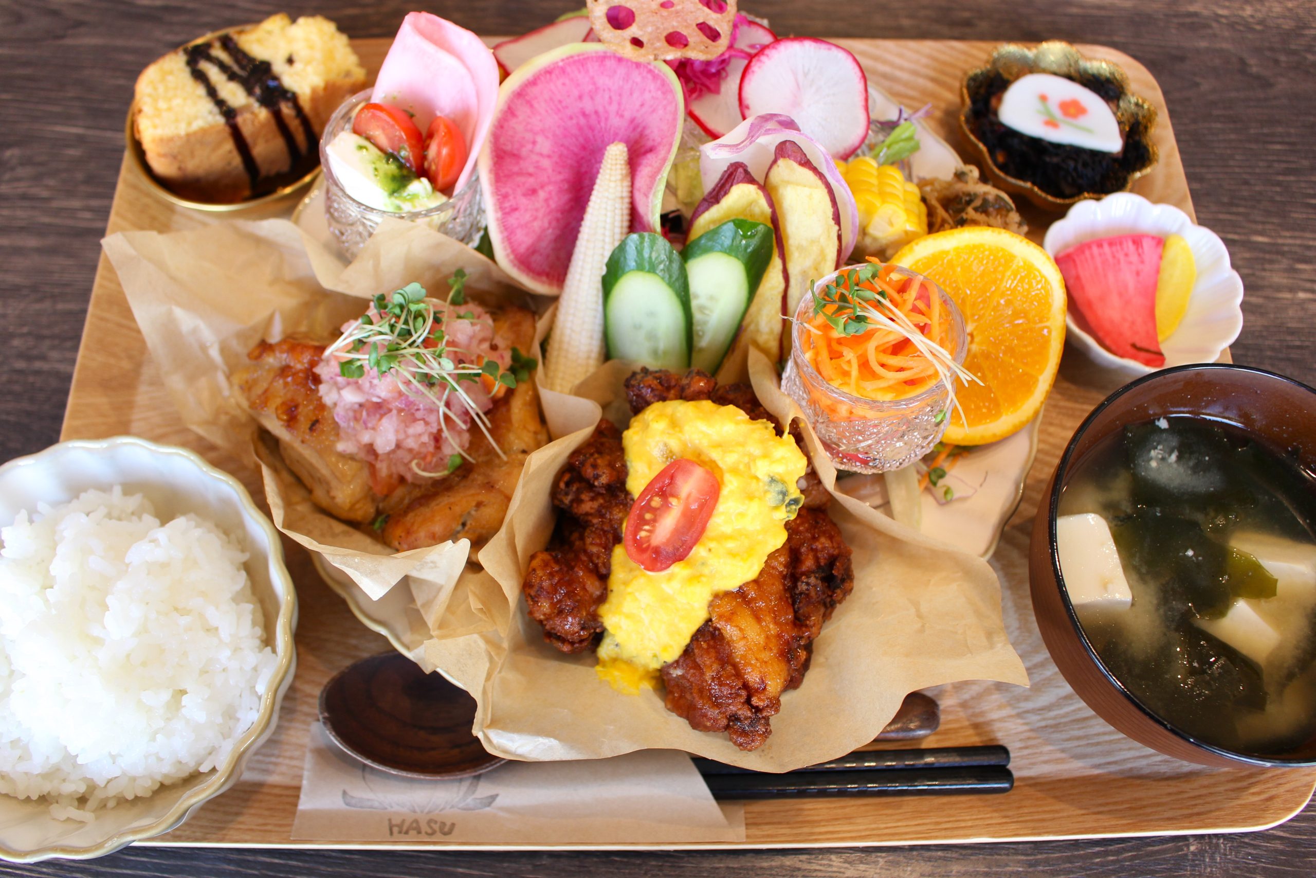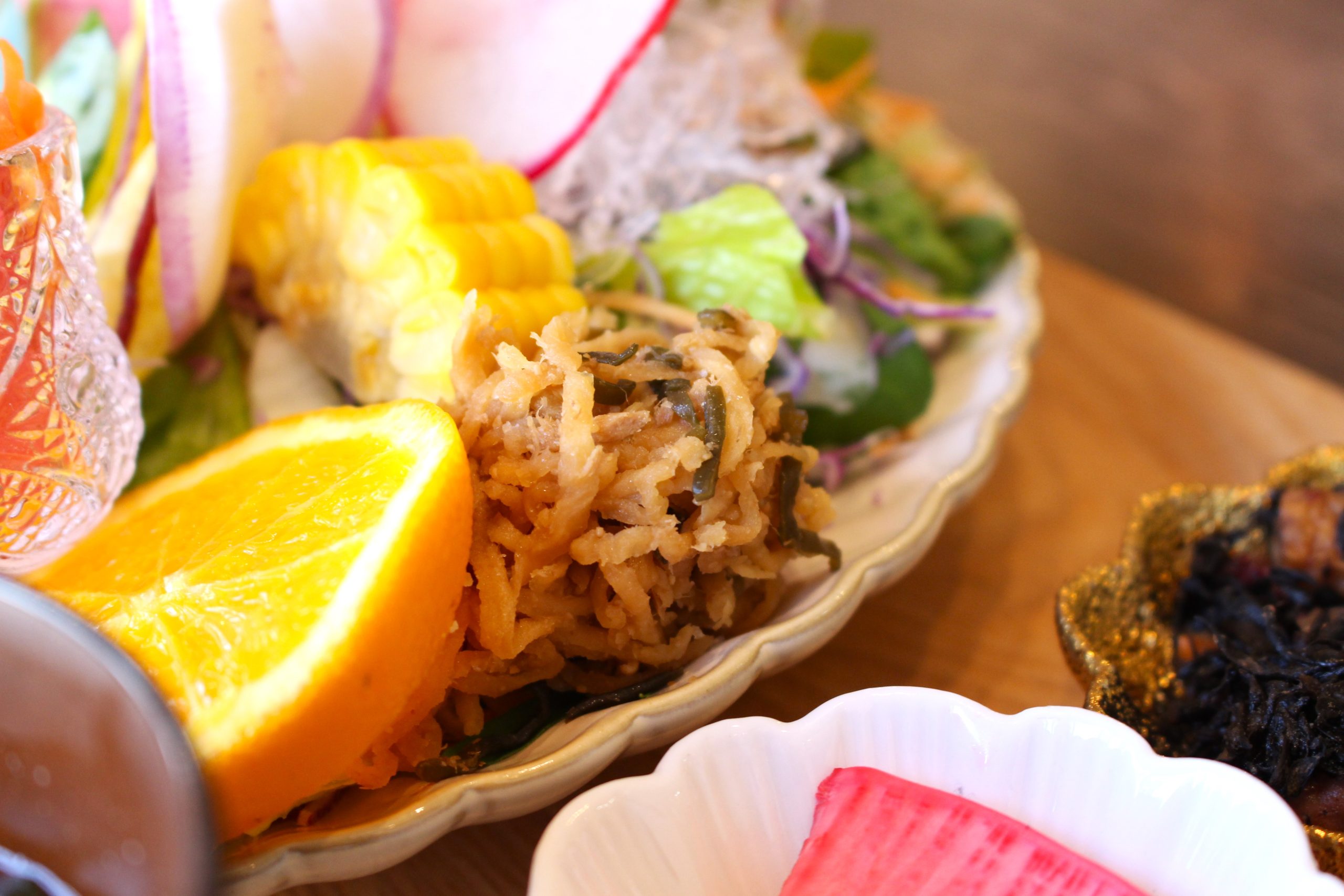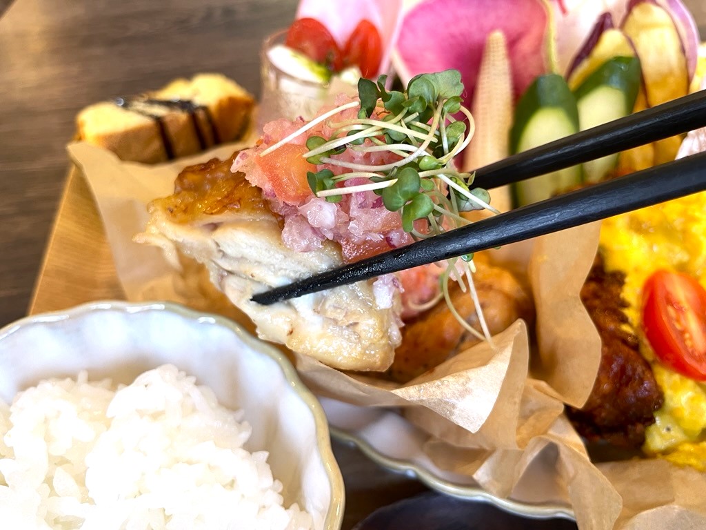 凄いのはボリュームだけにあらず。例えば甘辛いタレがしみ込んだ揚げ鳥にはかぼちゃソースを、シンプルな塩焼き鳥にはサルサソースを合わせるなど、オリジナリティあふれる品々で舌を楽しませてくれる。パプリカの酢漬けや切り干し大根といった副菜も含めて、とにかく味わい・食感さまざま。達野さん曰く「おいしくてカラダに良いものはみんなにも食べてもらいたい!」とのことで、市場から新鮮な素材を仕入れては試作に励む日々なのだそう。そんな想いも込められているからか、スイーツに至るまですべて自家製で作られているランチは食べていてワクワクするのだ。