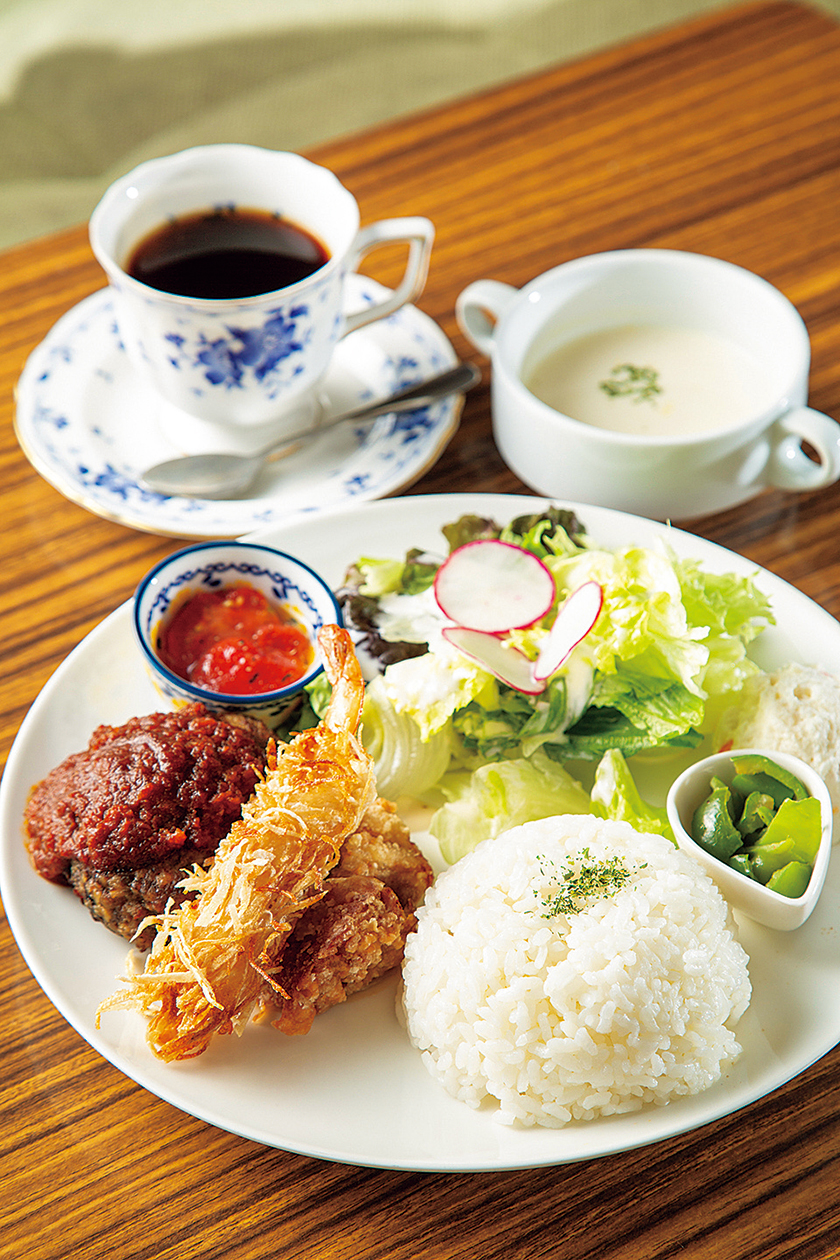 豊富な洋食メニューの中でも注目は、ふわとろ玉子のオムライス、千切りにしたジャガイモを衣にしたカリカリのエビフライ、ヘルシーな豆腐ハンバーグが一皿に集結した大人のためのお子様ランチ、その名も「大人様ランチ」だ。