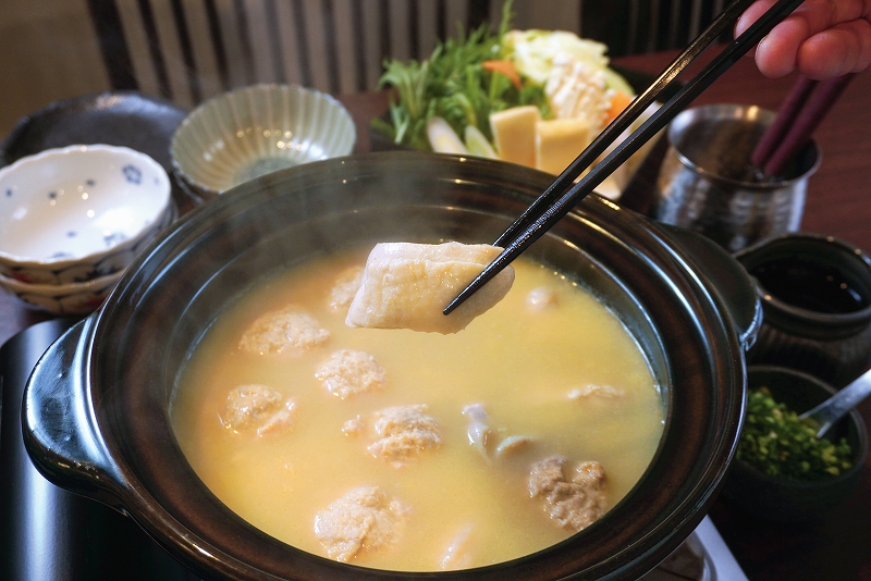 「高級ではなく、上等なものを」との思いを込めて提供される、水炊き1人前3,080円。鶏ガラと水のみをじっくり炊き上げて作られる白濁スープには、鶏本来のうま味とコクが凝縮されており、口にすると思わず頬が緩む。鶏肉は佐賀のブランド鶏〈ありたどり〉の中でも、特にうま味があるもも肉だけを使用。滋味あふれる極上の水炊きを堪能しよう。