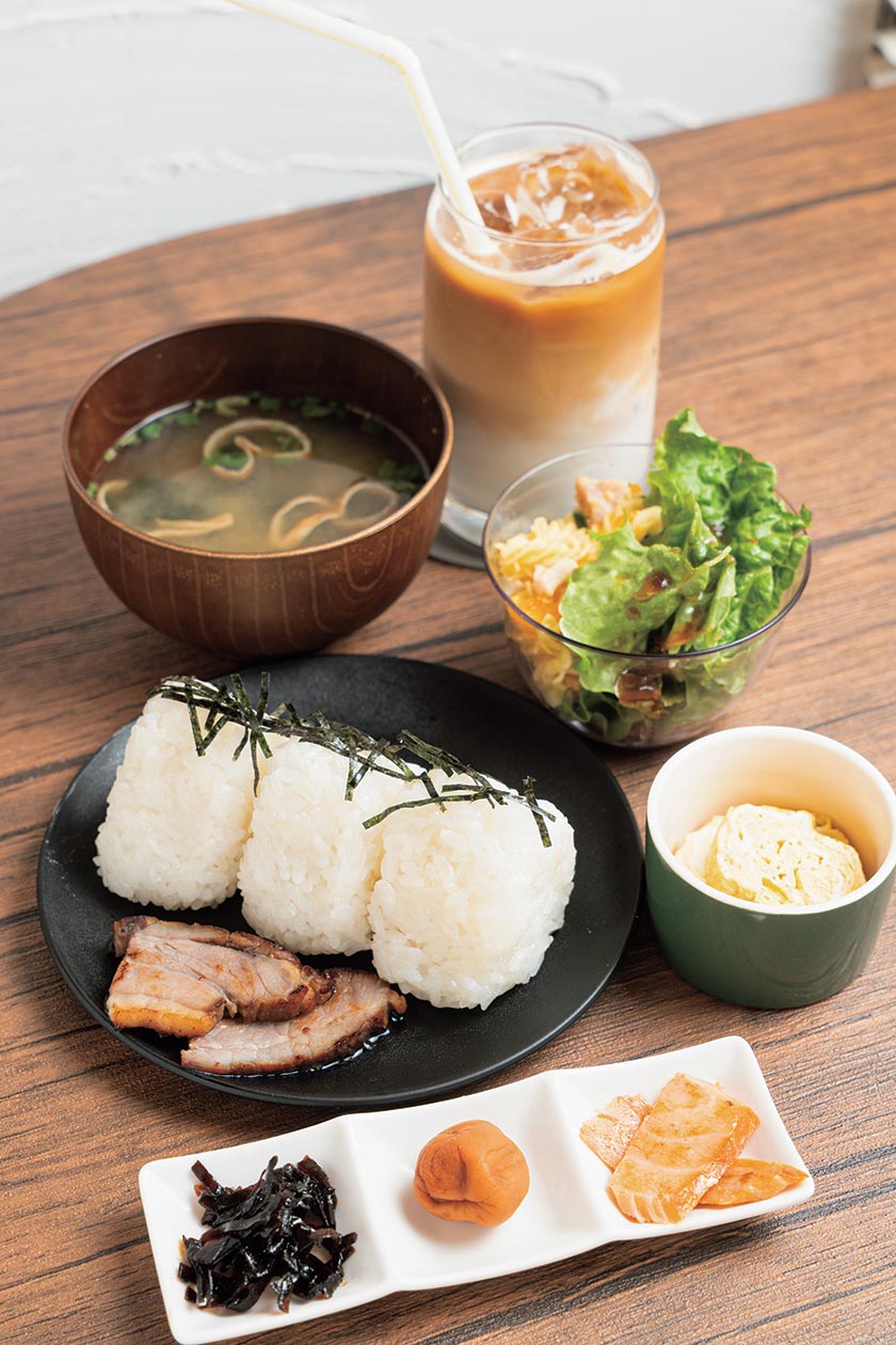 モーニングは、おむすび3つ、フォカッチャ、厚切りトーストのいずれかに、ベーコンや目玉焼き、ドリンクが付くセットを用意。