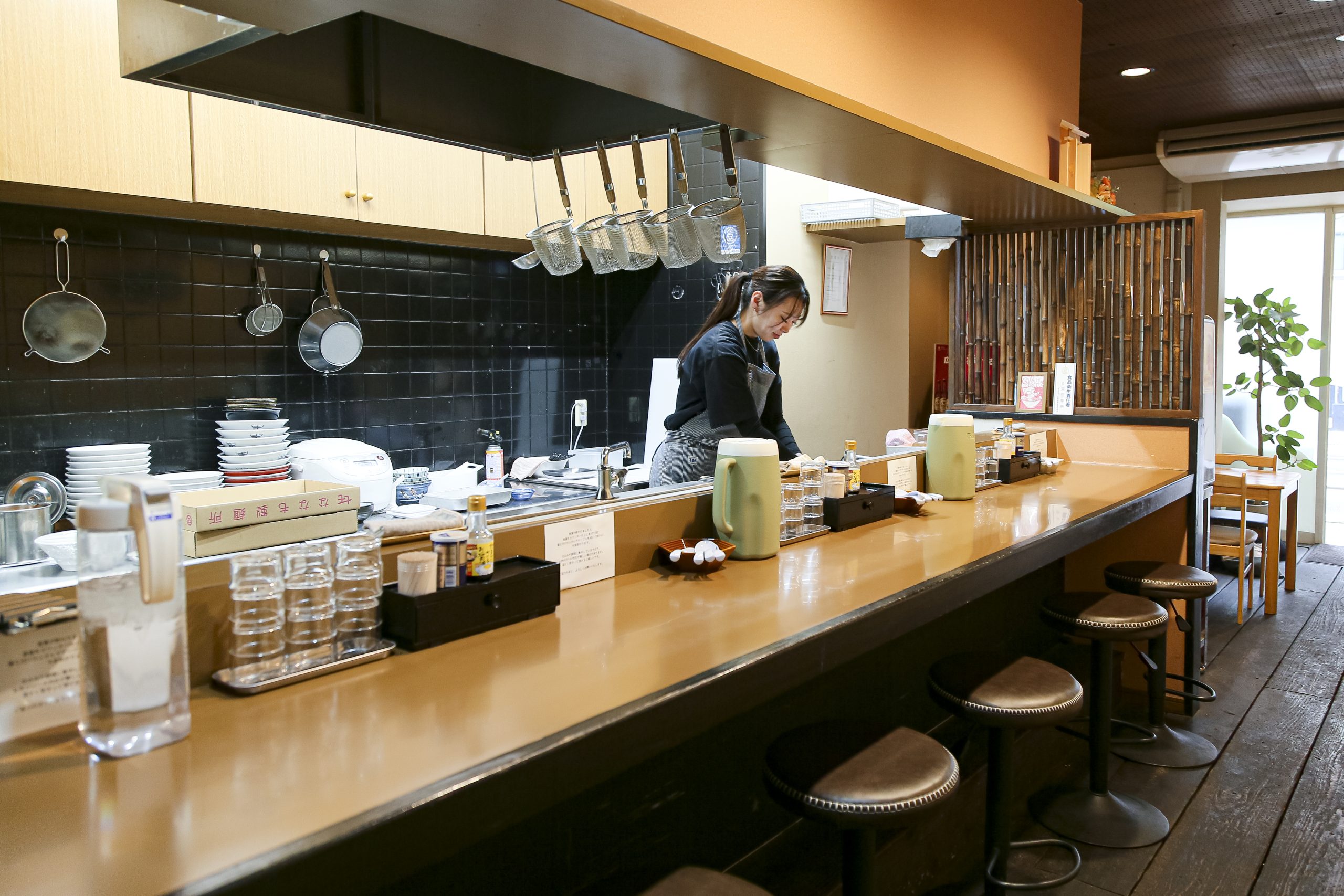 JR福山駅東側の高架下に建つ。印象的な白い外観と、〝ら〟の文字を目印に訪れて。店内には、カウンター6席、テーブル4席を設ける。入り口の券売機で食券を購入して席に着こう。