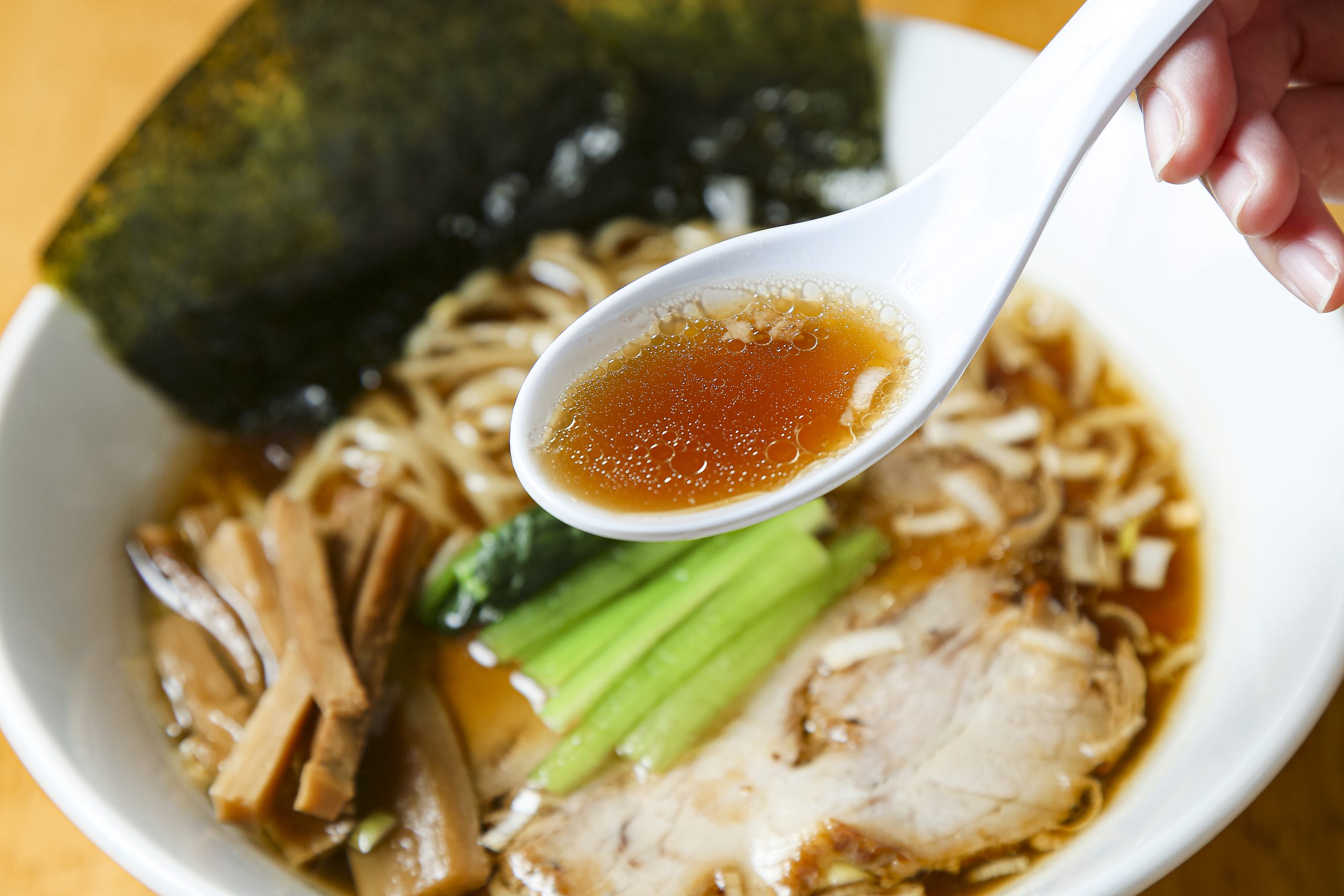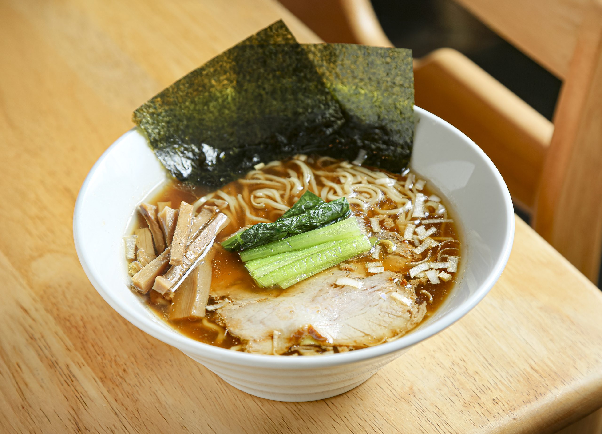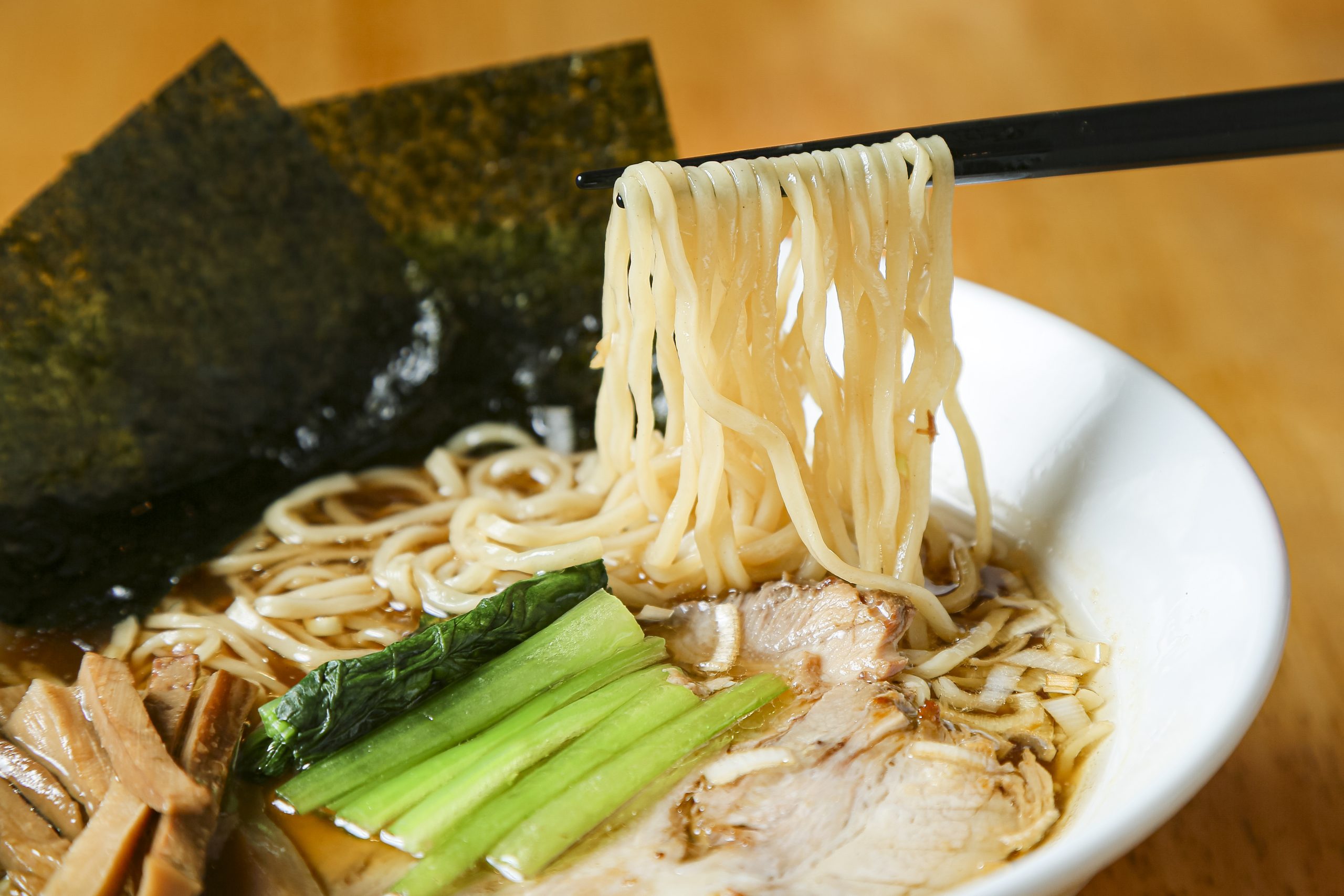 豚の背ガラや鶏ガラなどを使って炊いたスープに、1.5kgものショウガを入れている。「ショウガの豊かな香りを感じられるように」という店主の思いから、切り方を変えて研究を続けているのだそう! ショウガの風味が感じられる、あっさりしょうゆ味の特製スープを、コシの強いちぢれ麺に絡めて召し上がれ。