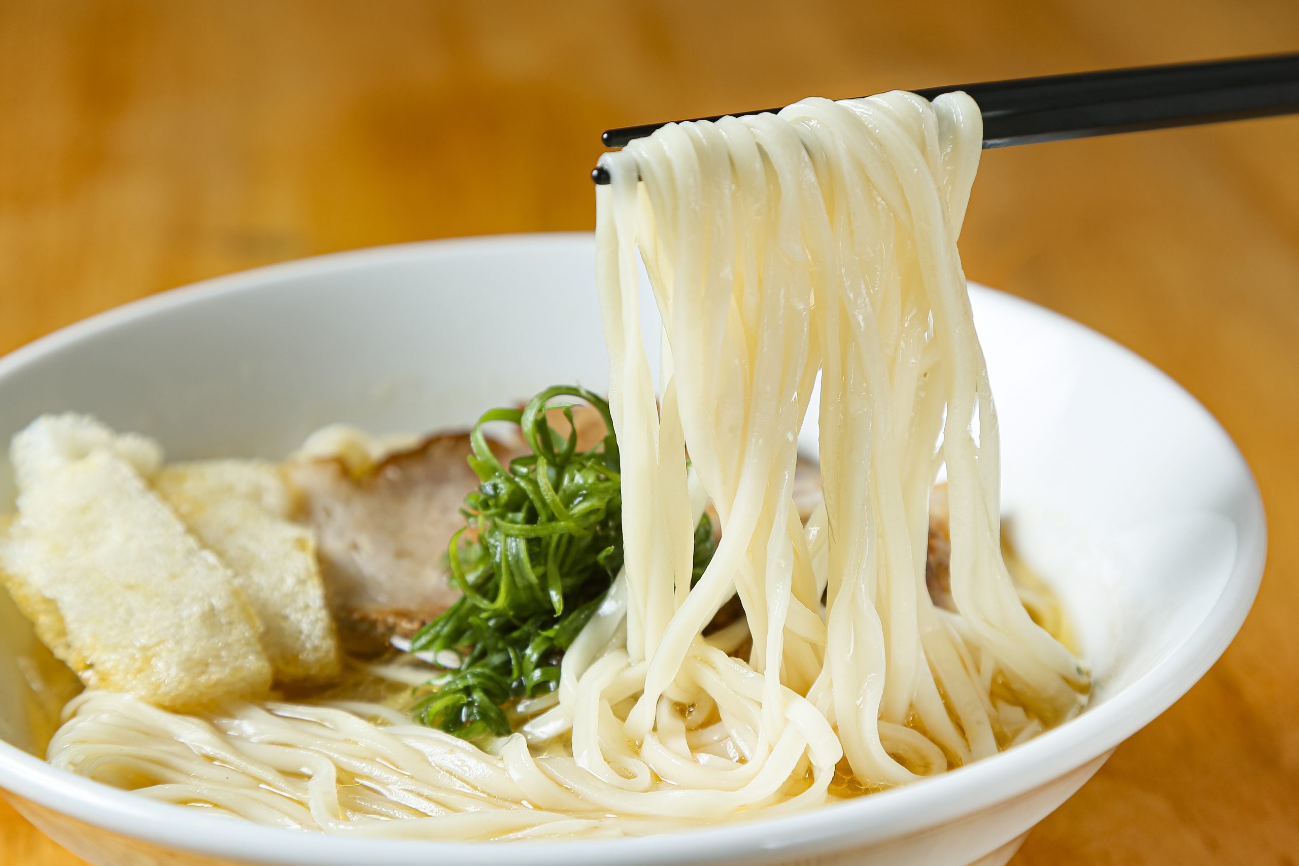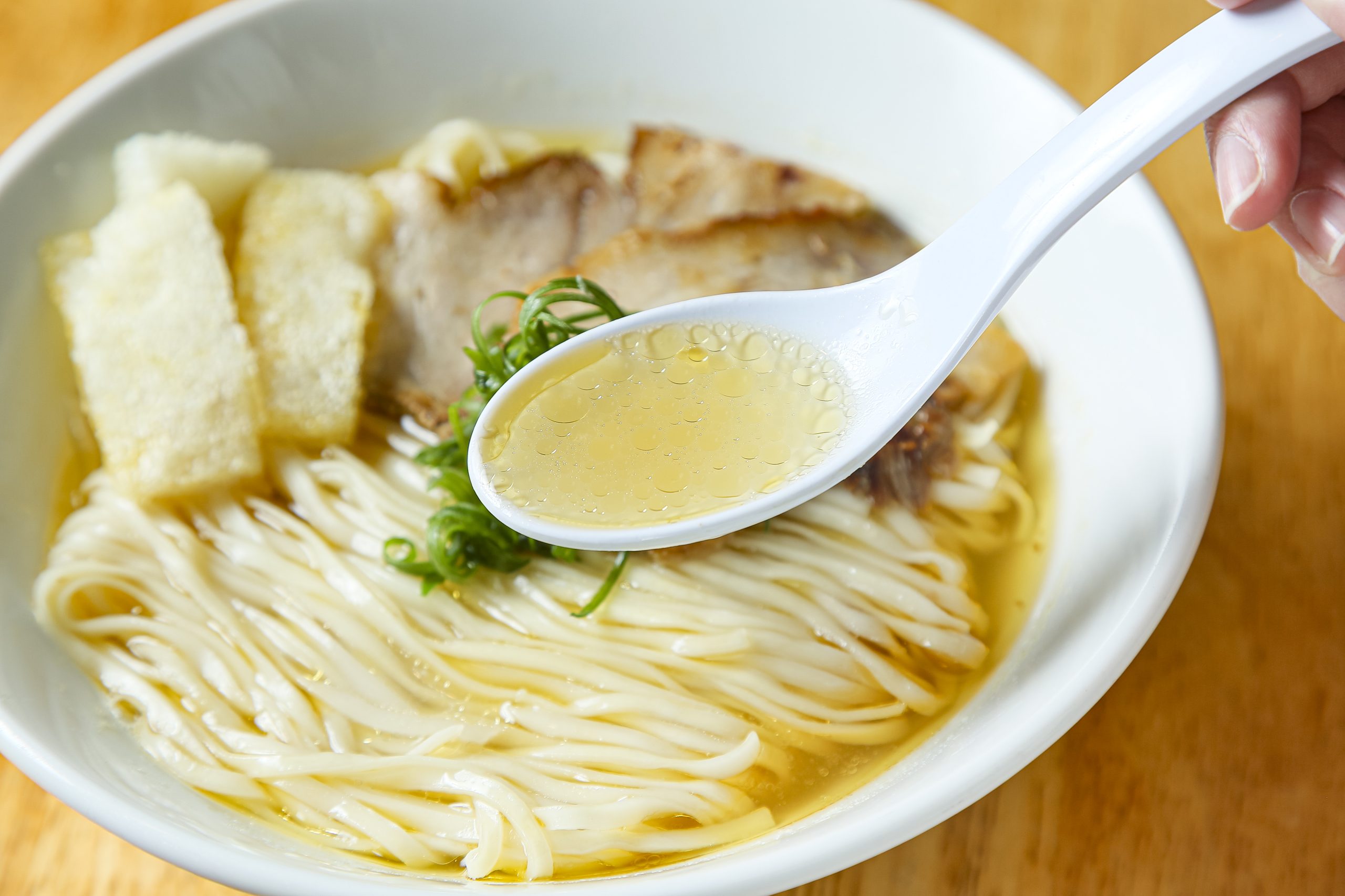 麺は『こばやし』の自家製平麺を使用。つるつるとのど越しが良いうえ、スープとの一体感も感じられる。トッピングは、豚ウデ肉のチャーシューや「松山あげ」をオン。松山あげとは、愛媛県の特産品でサクサクふわふわ食感が自慢の油揚げだ。そのまま食べるほか、スープをたっぷり含ませたりして楽しむのもいい。