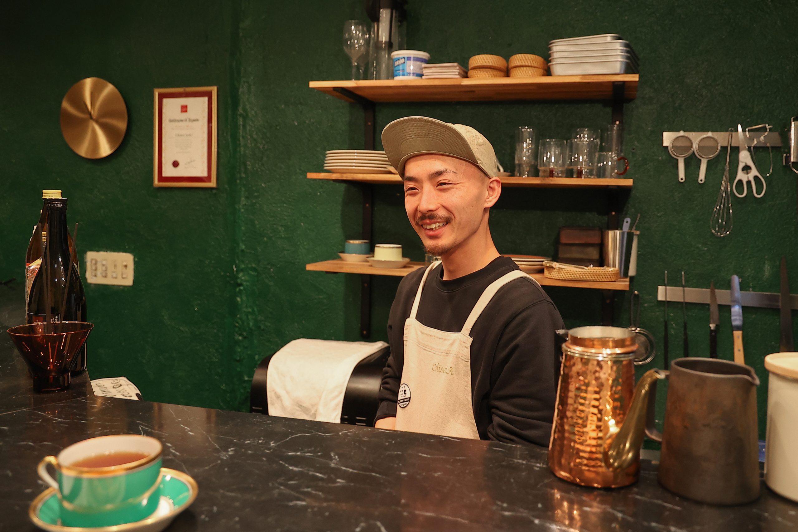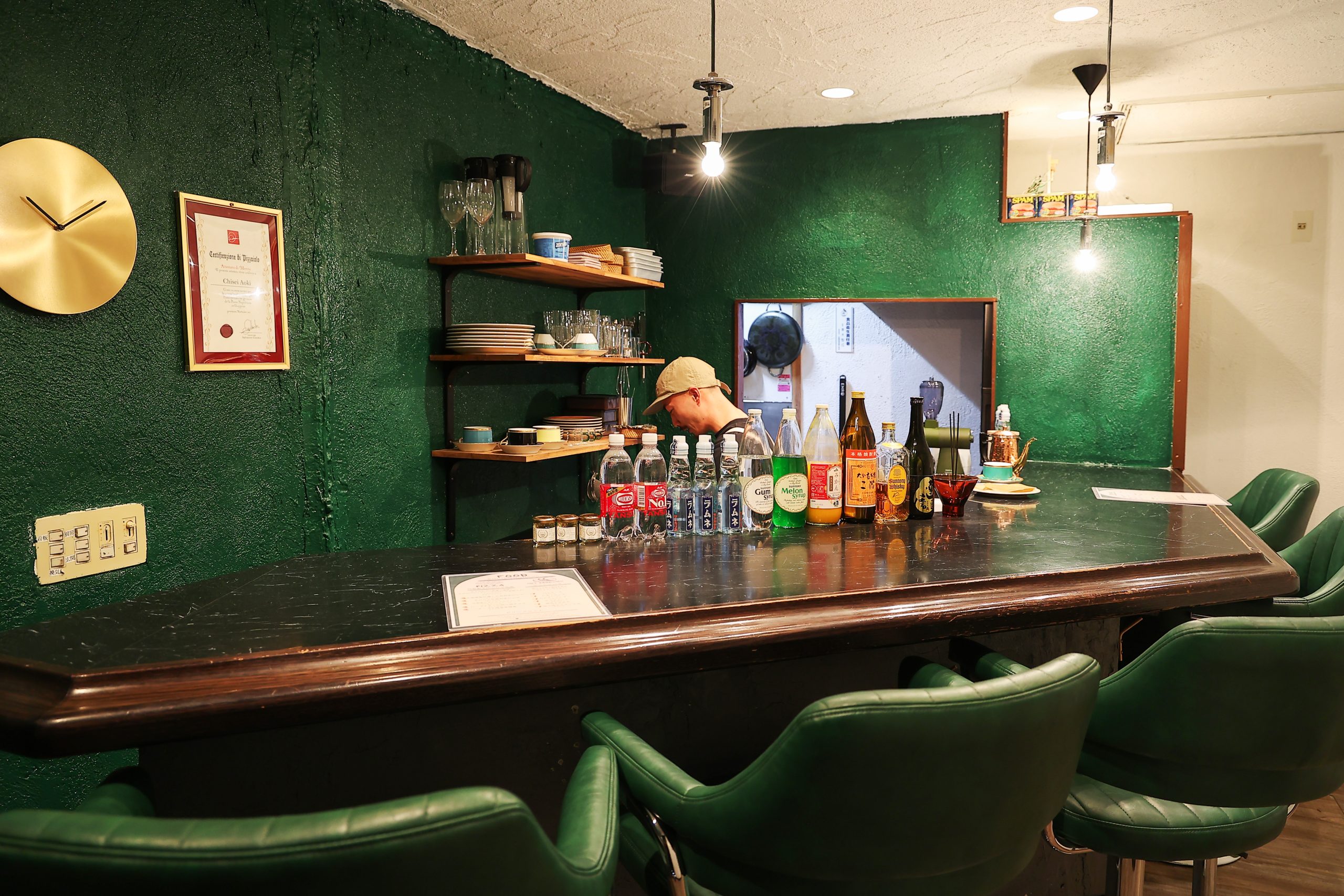 元スナックを改装した、こぢんまりとした店内。壁や椅子などが深みのあるグリーンで統一されており、シックな雰囲気が感じられる。カウンター席のほか、同じく緑色で合わせたテーブル席もあり。